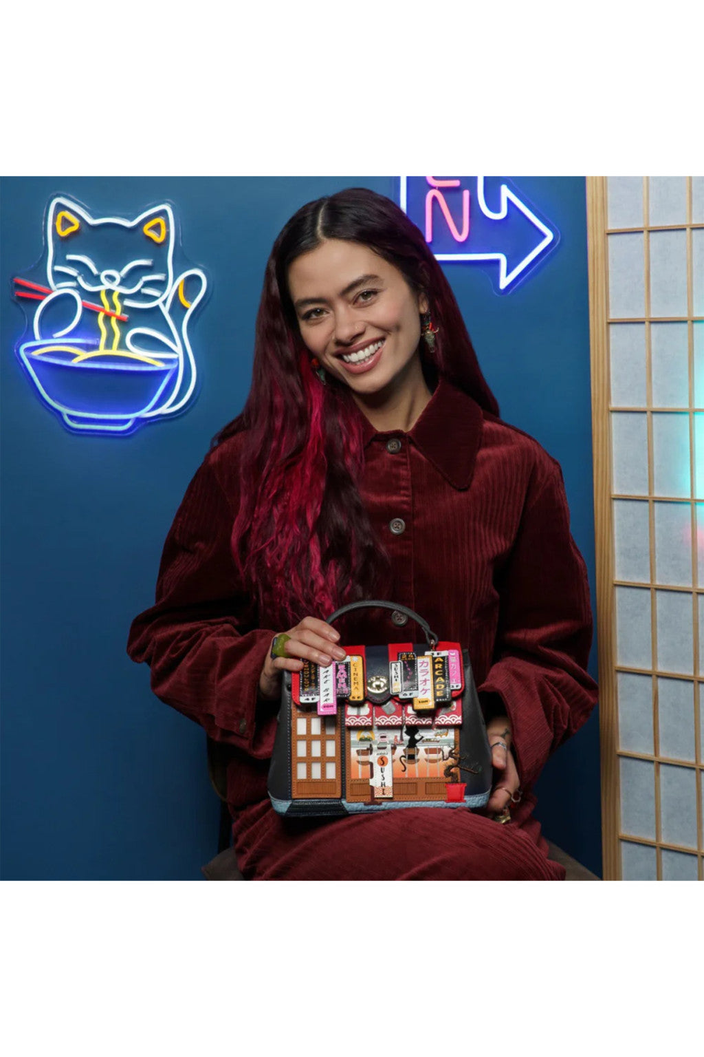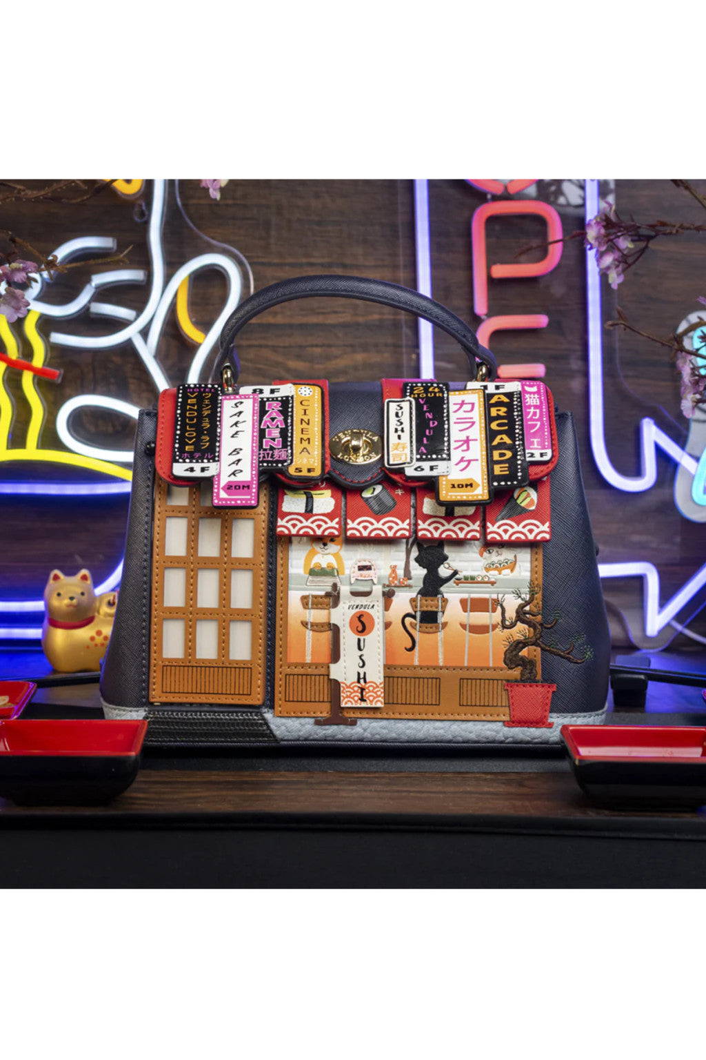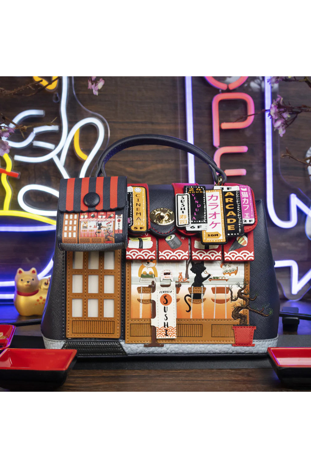 Se l’hai adorata nella versione grigia, impazzirai per questa nuova variante di colore! La Borsa Grace Vendula Sushi - Blue Edition è un must per l’uso quotidiano. È realizzata in pelle vegana, con un comparto spazioso e alcune tasche nascoste sotto un incantevole patta nera e rossa a forma di tenda. È dotata sia di un comodo manico che di una cinghia rimovibile per una maggiore versatilità. Ha anche dei piedini alla base per mantenere la borsa pulita e stabile. Decorata con delle insegne al neon, una porticina apribile e i nostri amati chef pelosi, questa borsa ti trasporta in un vivace ristorante di sushi pieno di vita e… sapore! Mangi qui o preferisci l’asporto?