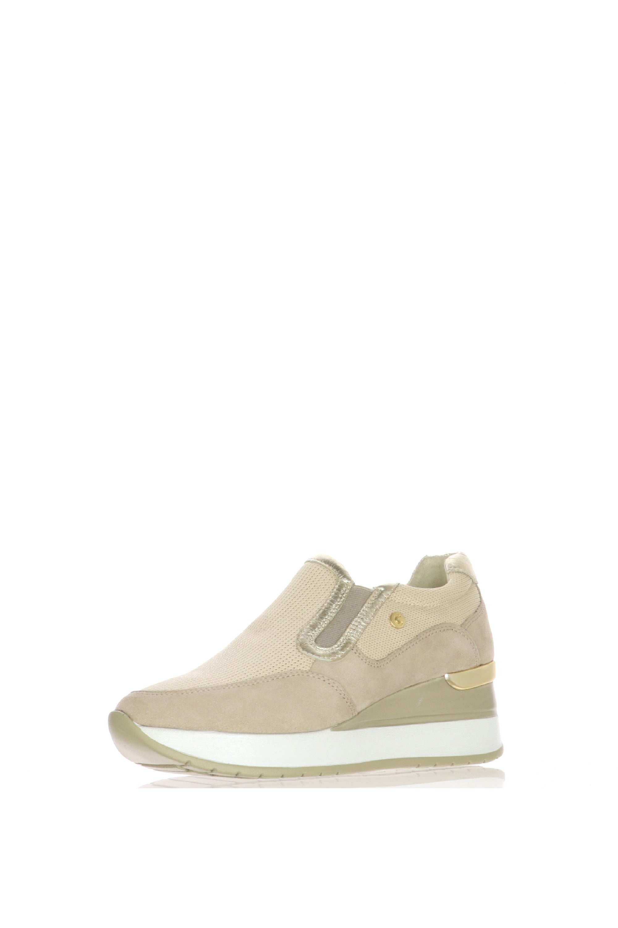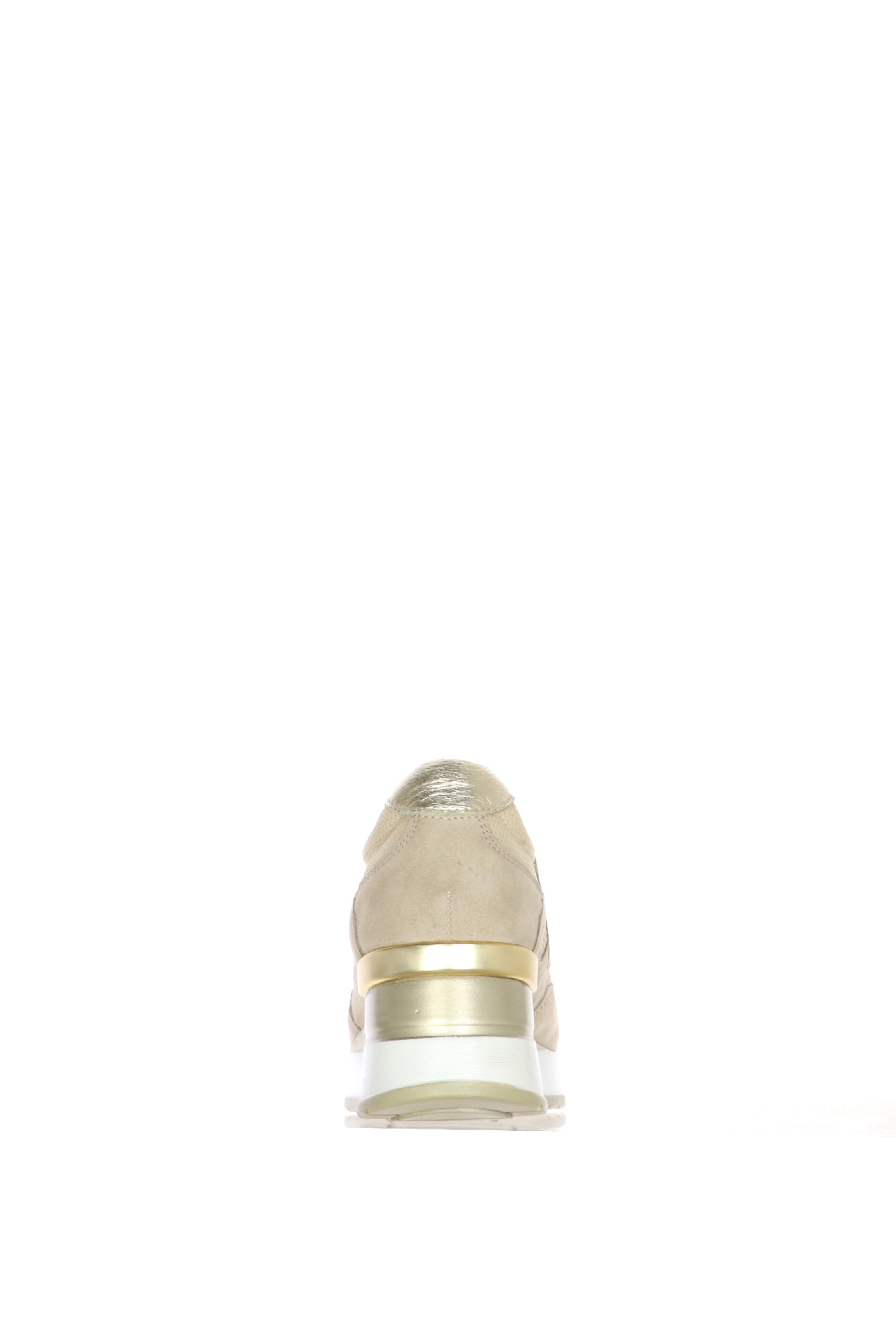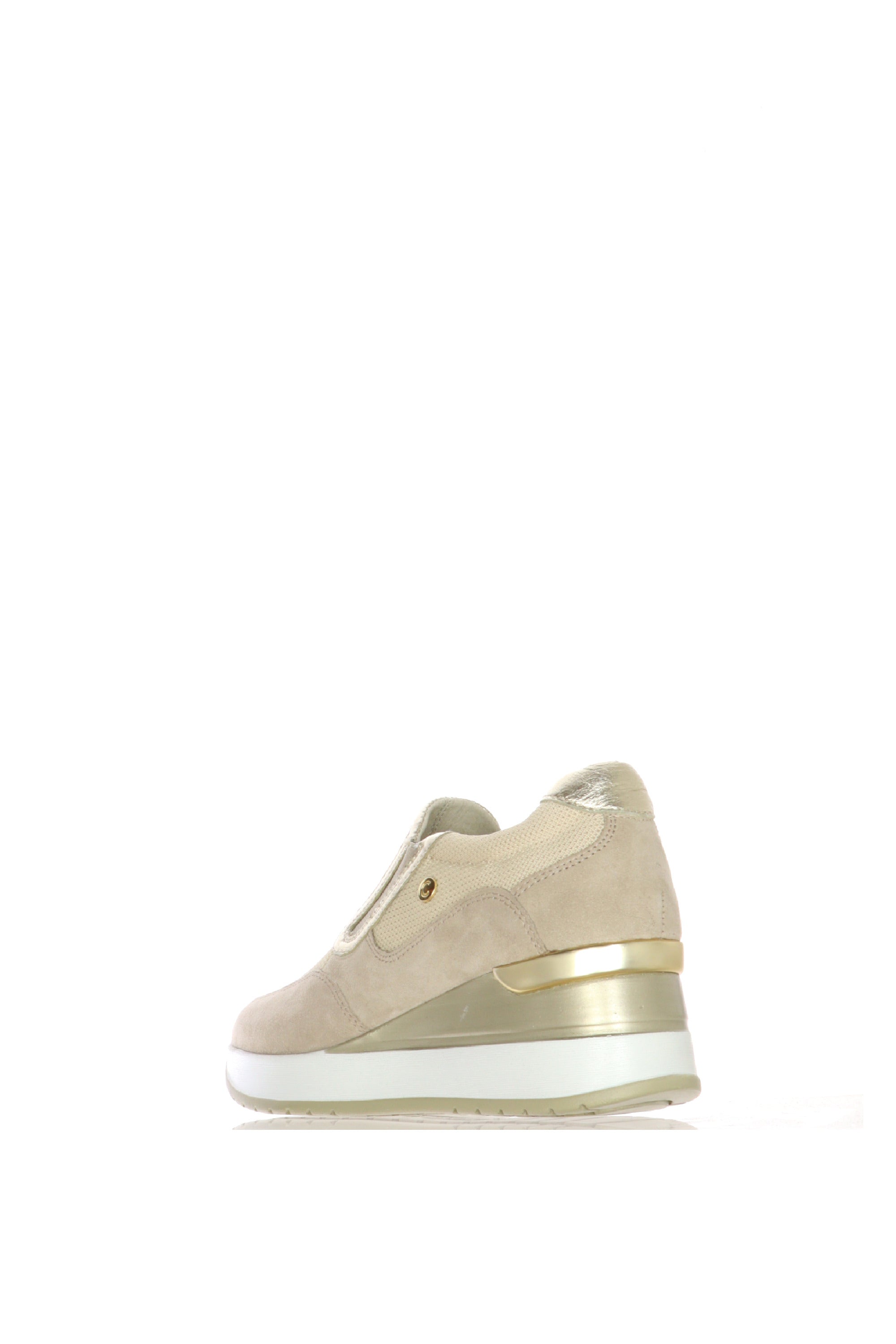 Il modello Cinzia Soft rappresenta l'eccellenza della calzatura comfort italiana. Questa slip-on è particolarmente apprezzata per la sua versatilità: abbastanza sobria per contesti formali, ma sufficientemente sportiva per il tempo libero.Scopri la fusione perfetta tra l'eleganza di un mocassino e la dinamicità di una sneaker con questa slip-on Cinzia Soft. Caratterizzata da una tonalità beige neutra e sofisticata, questa calzatura è la scelta ideale per la donna che desidera uno stile impeccabile senza rinunciare alla leggendaria comodità del brand italiano.Gli inserti in pelle laminata oro lungo il profilo della linguetta e sul retro, insieme al piccolo logo metallico laterale, aggiungono un tocco di luce glamour che eleva il design sportivo.Perfetta da abbinare a pantaloni chino color crema, jeans lavaggio chiaro o a un completo sportivo in maglina. Il colore beige neutro la rende un jolly stagionale facilmente coordinabile con qualsiasi palette cromatica.