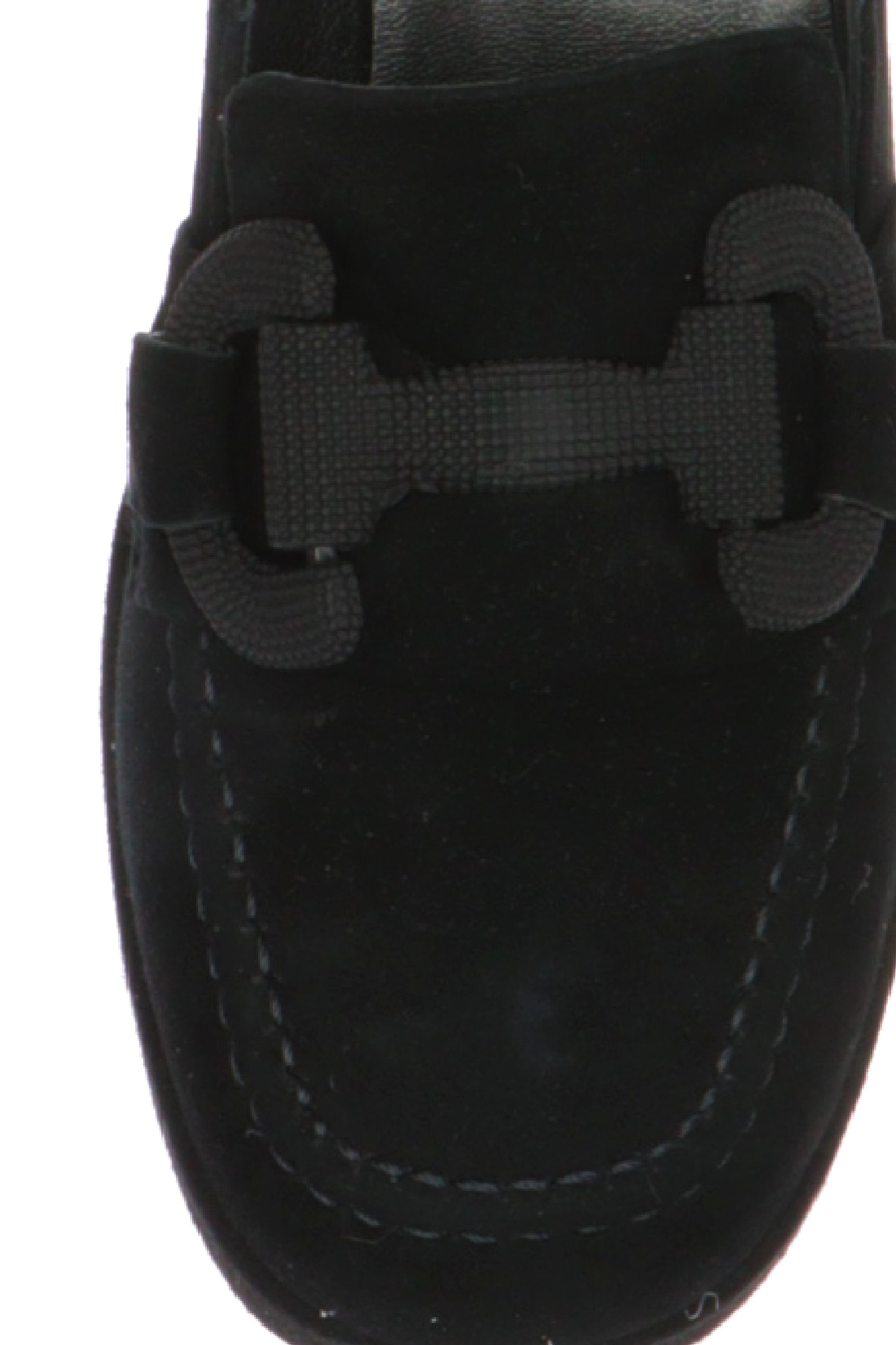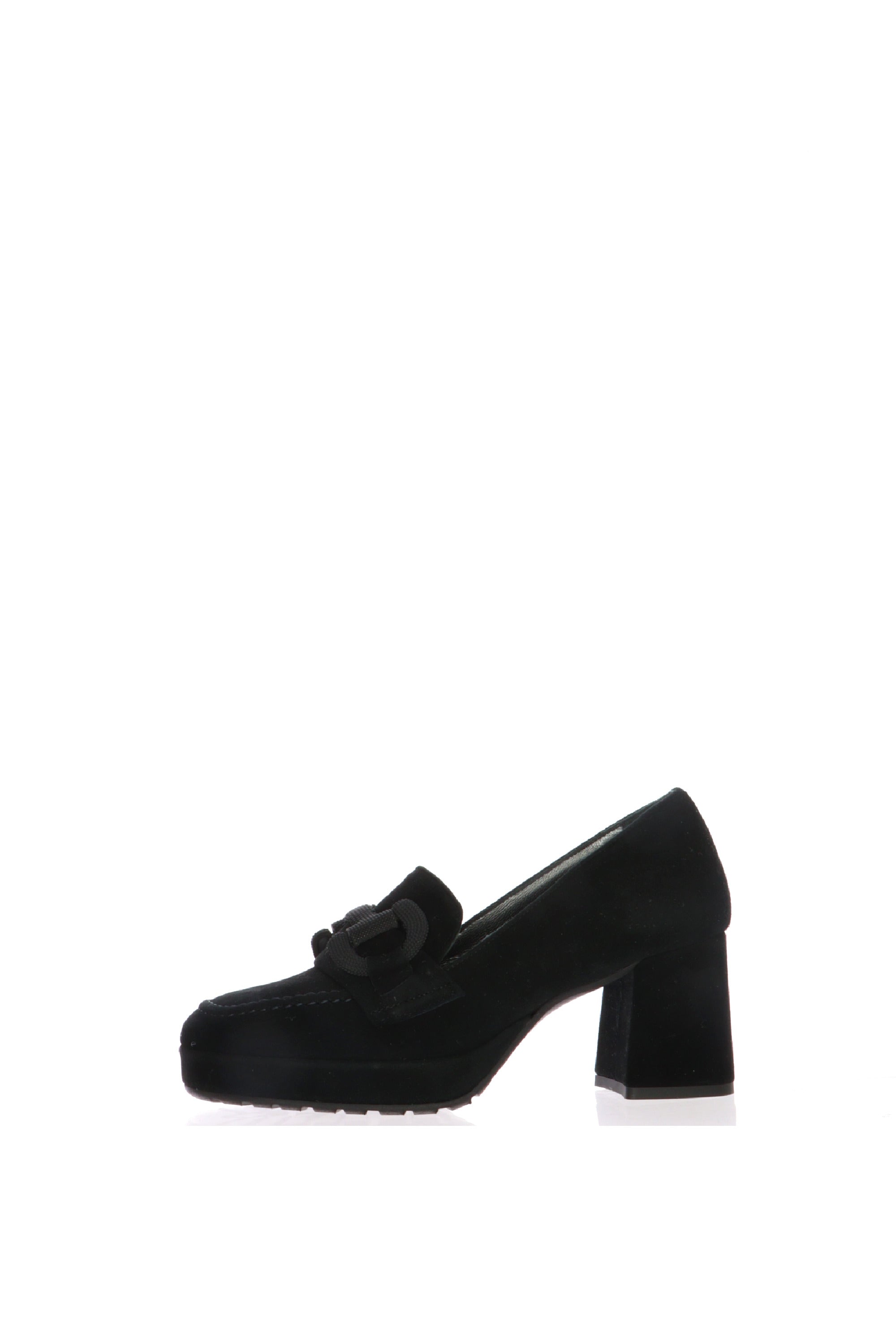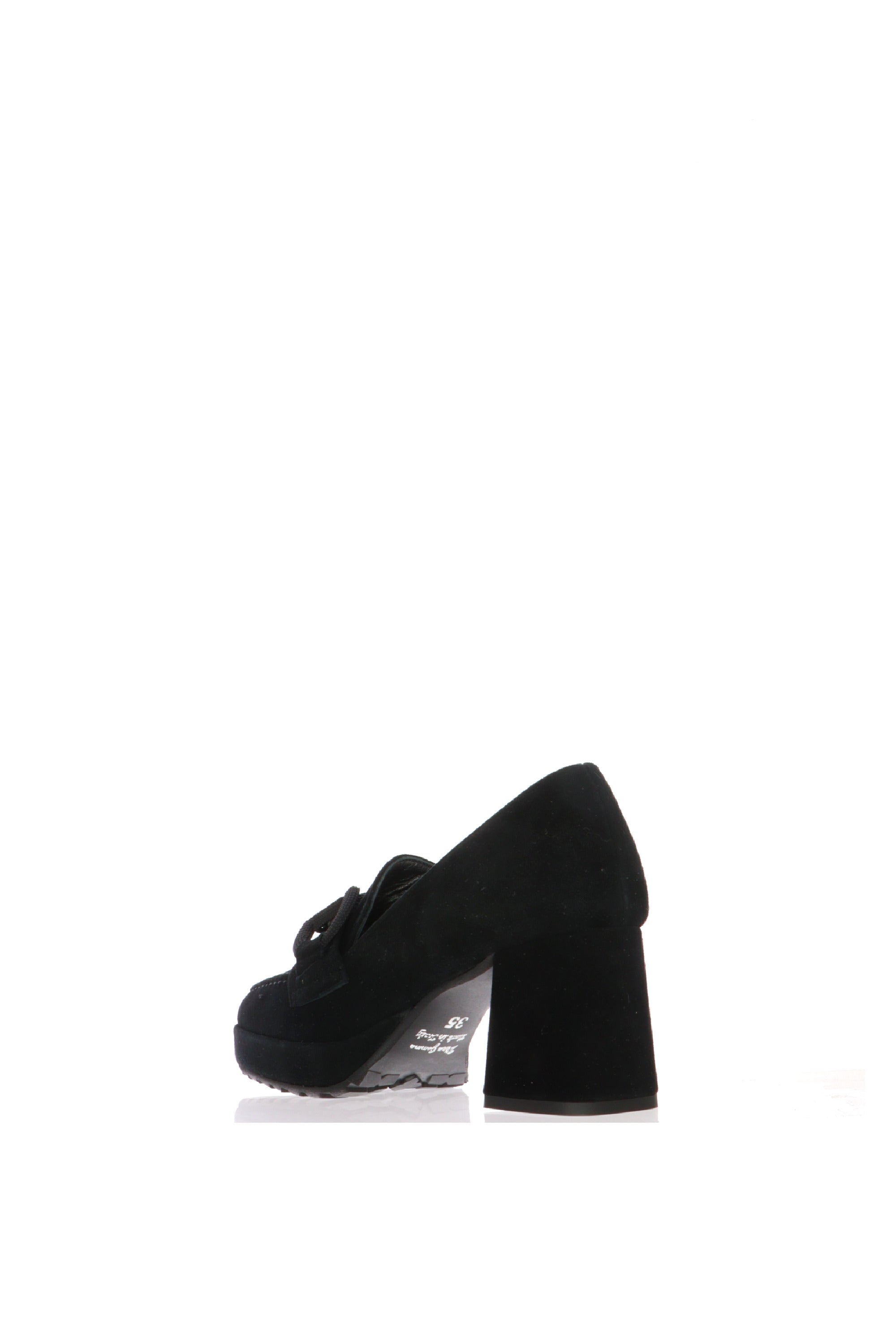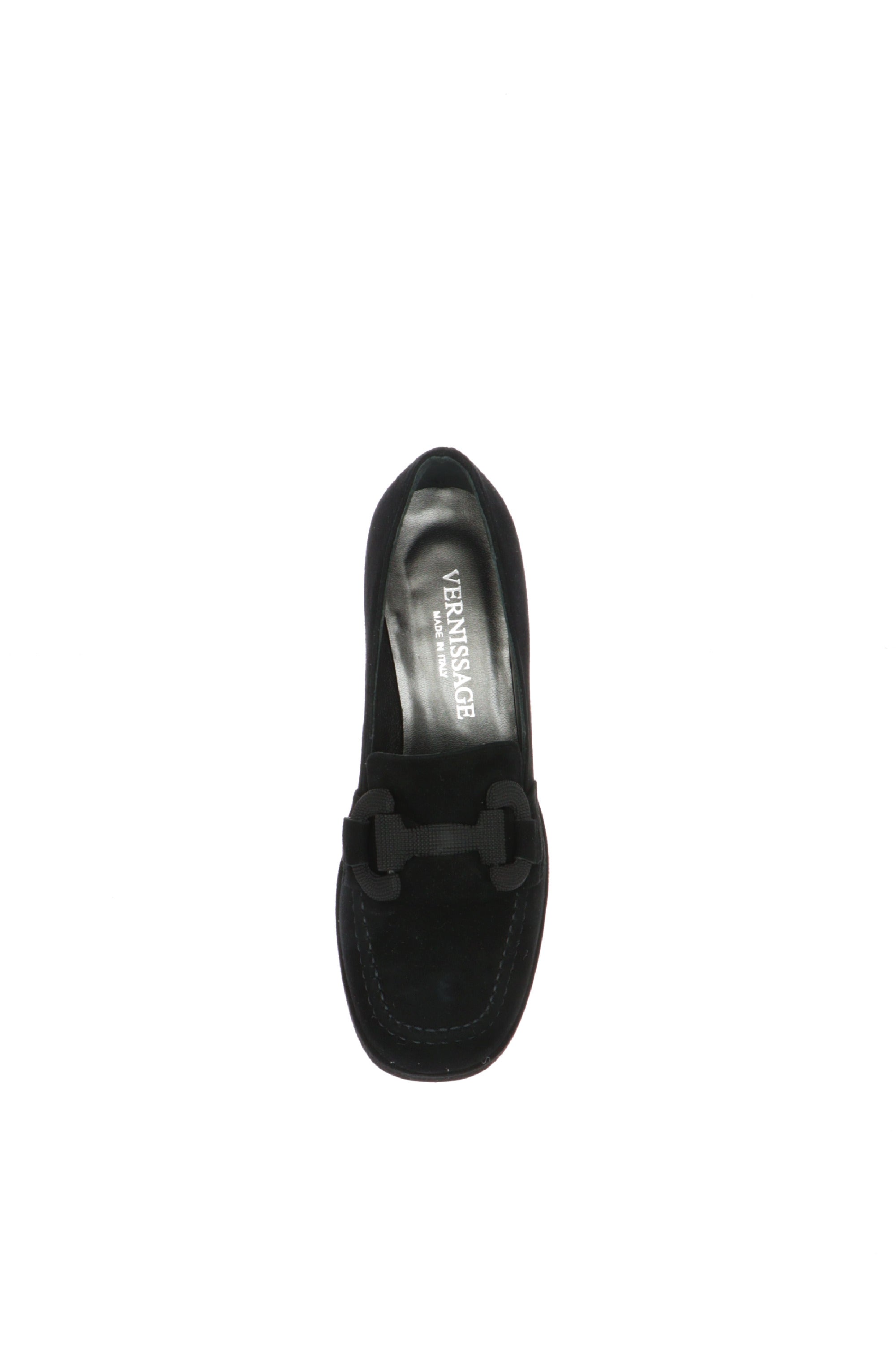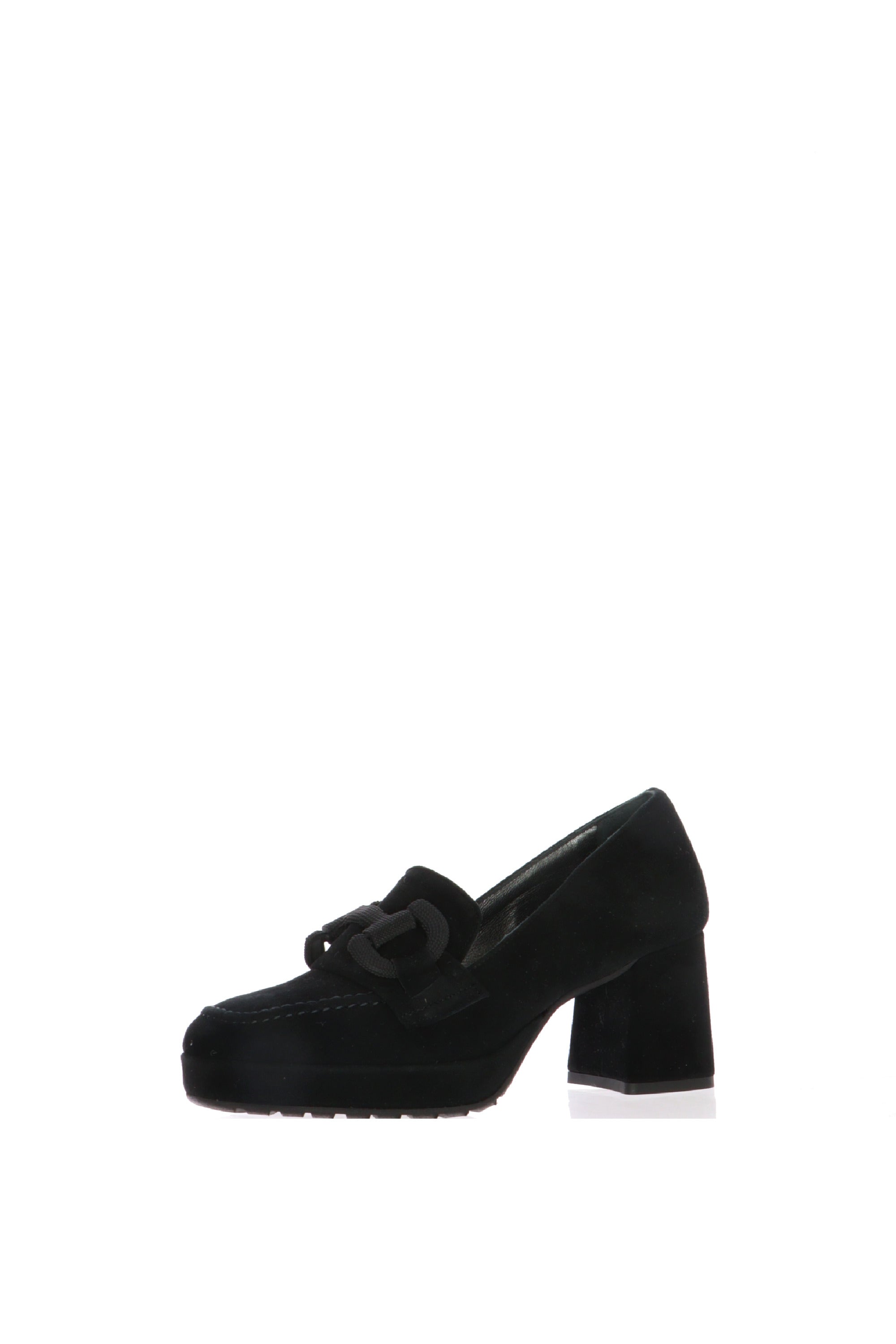 Mocassino camoscio nero Vernissage con accessorio catena e tacco largo. Punta quadrata e plateau. Il top della tendenza per questa stagione! Il confort che non ti spetti con Vernissage!