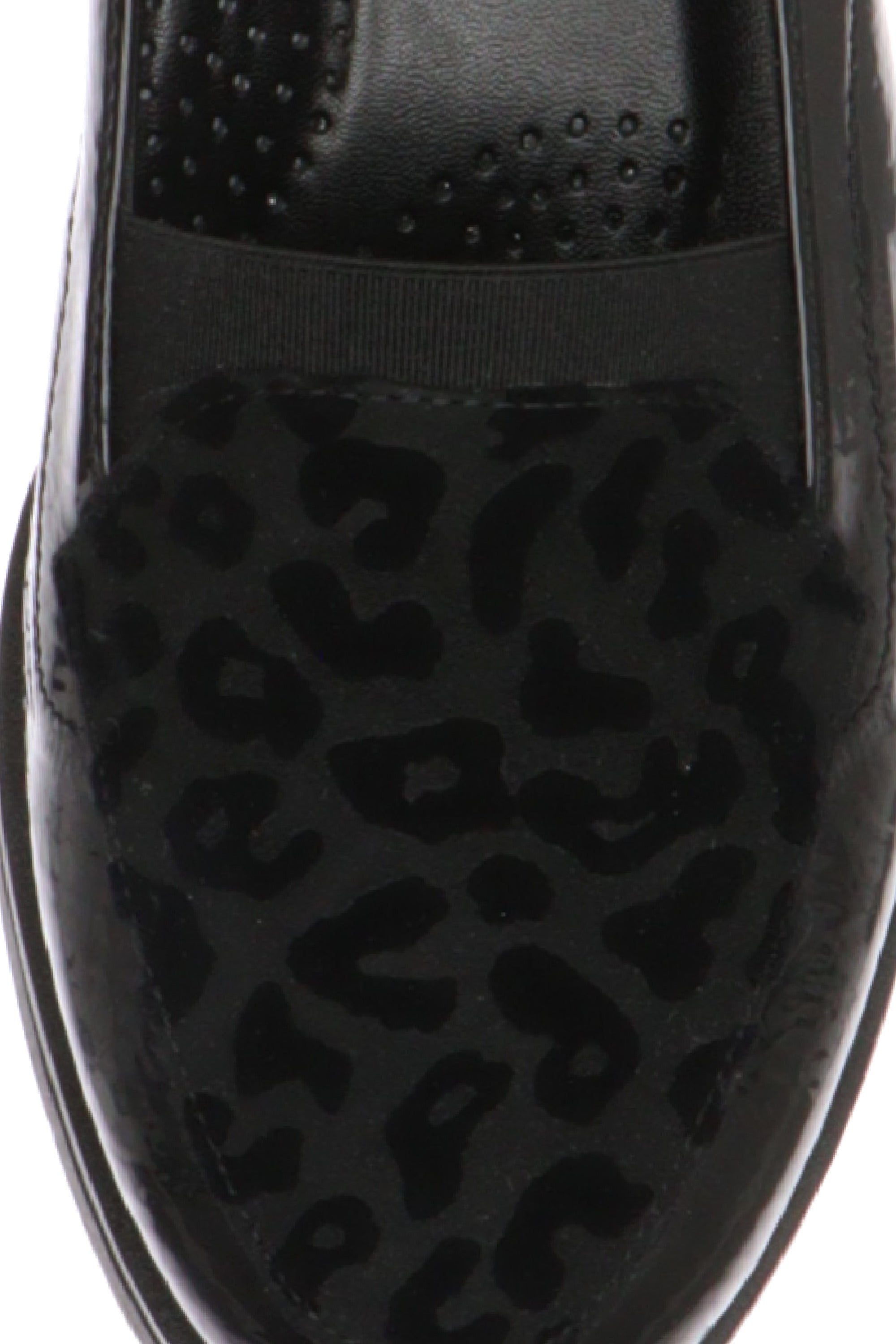 Realizzato in pelle verniciata nera lucida, questo mocassino cattura la luce ad ogni passo. La punta presenta un affascinante inserto in tessuto con motivo animalier tono su tono, che aggiunge un tocco di grinta e originalità. La zeppa leggera offre un rialzo discreto e stabile, ideale per slanciare la figura senza sacrificare la comodità, rendendolo perfetto da indossare tutto il giorno.
