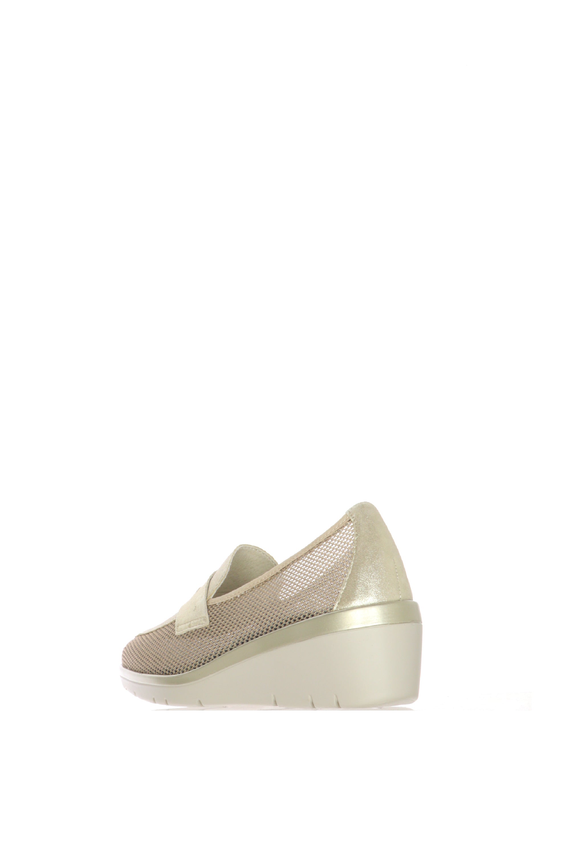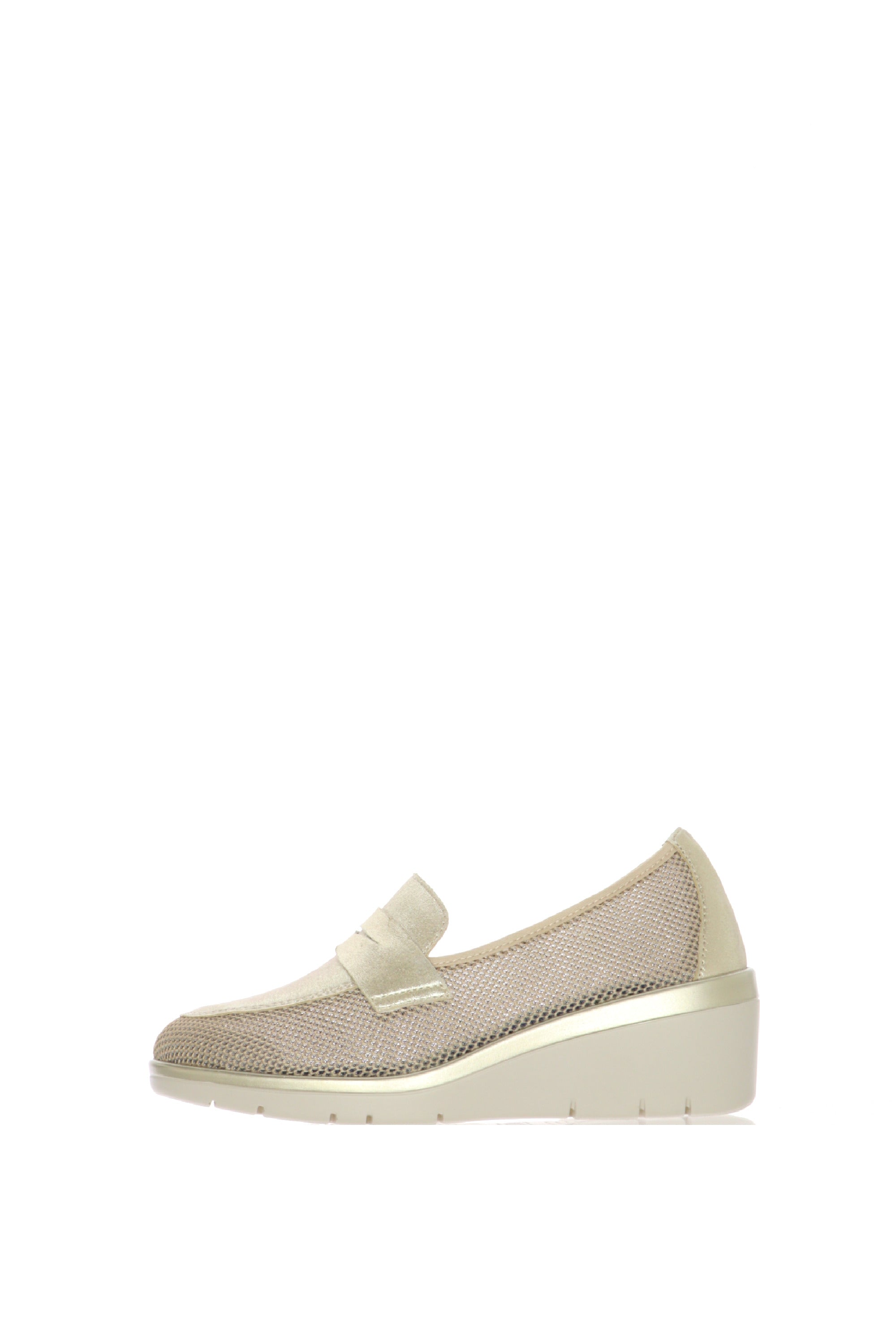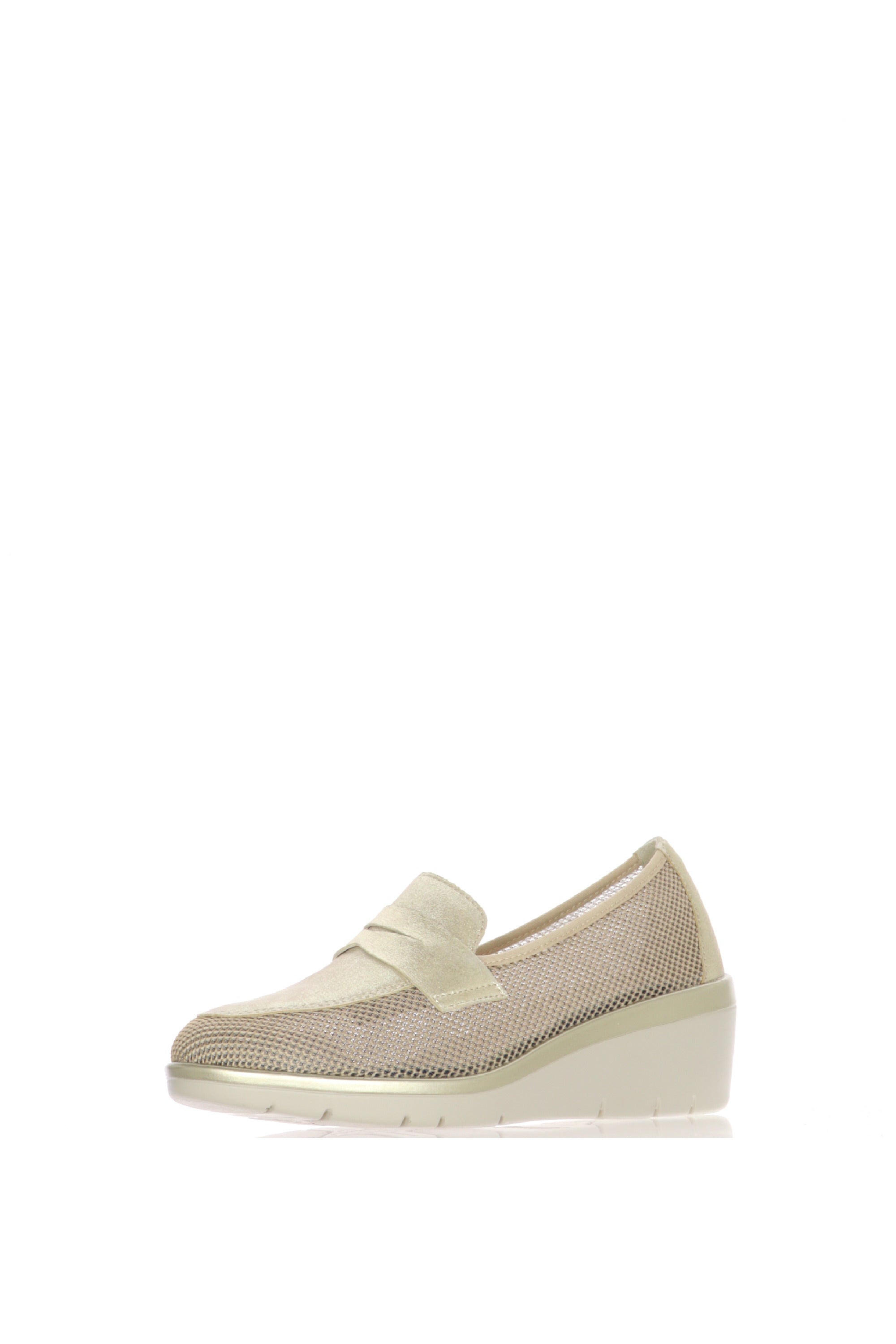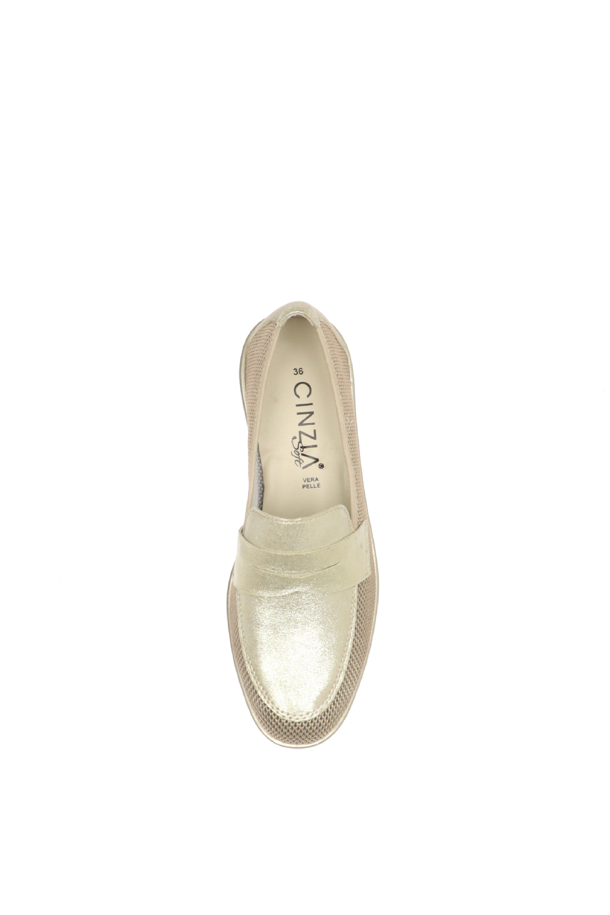 Rinnova il tuo guardaroba estivo con il mocassino Cinzia Soft, una calzatura che ridefinisce il concetto di eleganza quotidiana. Progettato per la donna che non vuole scegliere tra stile e benessere, questo modello combina materiali tecnici all'avanguardia con un finish luminoso e sofisticato.La tomaia è realizzata in un innovativo tessuto mesh a rete, che permette una ventilazione costante del piede, rendendo questa scarpa ideale per le giornate più calde o per chi sta in piedi molte ore.La punta e i profili sono impreziositi da un pellame effetto platino/oro laminato, che dona un tocco di luce discreto ma lussuoso, perfetto per illuminare i tuoi outfit da giorno.La zeppa media ultra-leggera offre il giusto supporto alla schiena, migliorando la postura senza appesantire la camminata. Il design scanalato della suola garantisce flessibilità e una tenuta sicura.