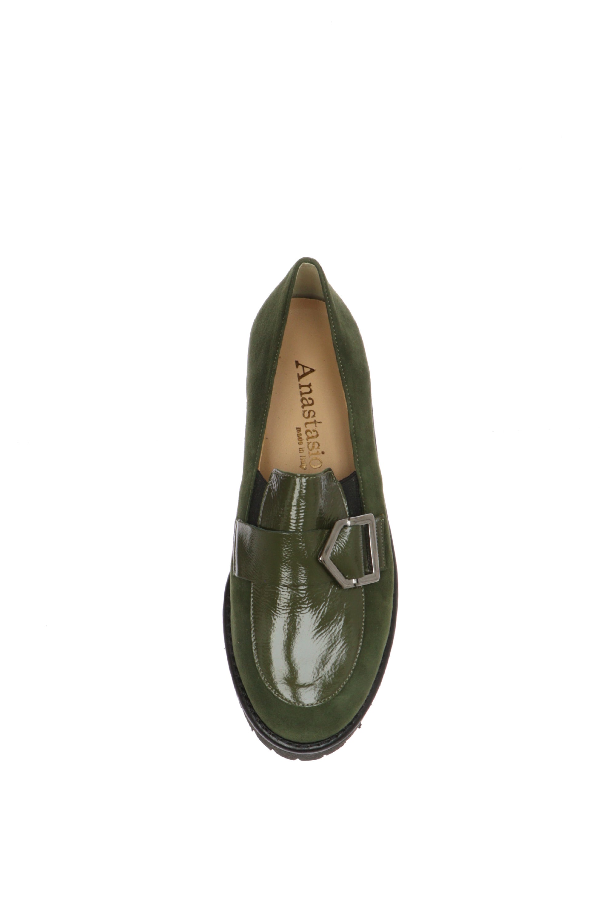Aggiungi un tocco di colore e stile al tuo guardaroba con i mocassini Anastasio in una sofisticata tonalità di verde. Questa scarpa unisce la classicità del mocassino a dettagli moderni, rendendola un pezzo unico e versatile per ogni occasione.Realizzati in una combinazione di morbida nappa e dettagli in vernice, questi mocassini offrono un look dinamico e ricercato. La fibbia a forma di esagono, in metallo argentato, aggiunge un tocco di carattere e raffinatezza, distinguendoli dagli altri mocassini. La suola carrarmato garantisce una presa sicura e uno stile contemporaneo, mentre la soletta interna, realizzata in vera pelle, offre comfort e traspirabilità per tutto il giorno.Un altro grande punto di forza è il plantare estraibile, che ti permette di personalizzare la calzata o di inserire un plantare ortopedico per un benessere su misura. Scegli la qualità made in Italy e regala ai tuoi piedi un mix perfetto di eleganza, comfort e originalità.