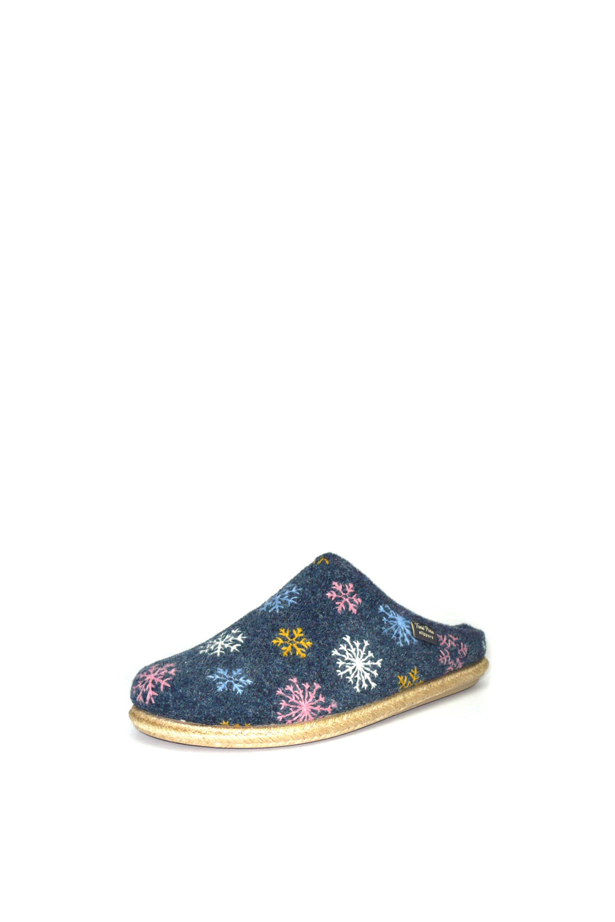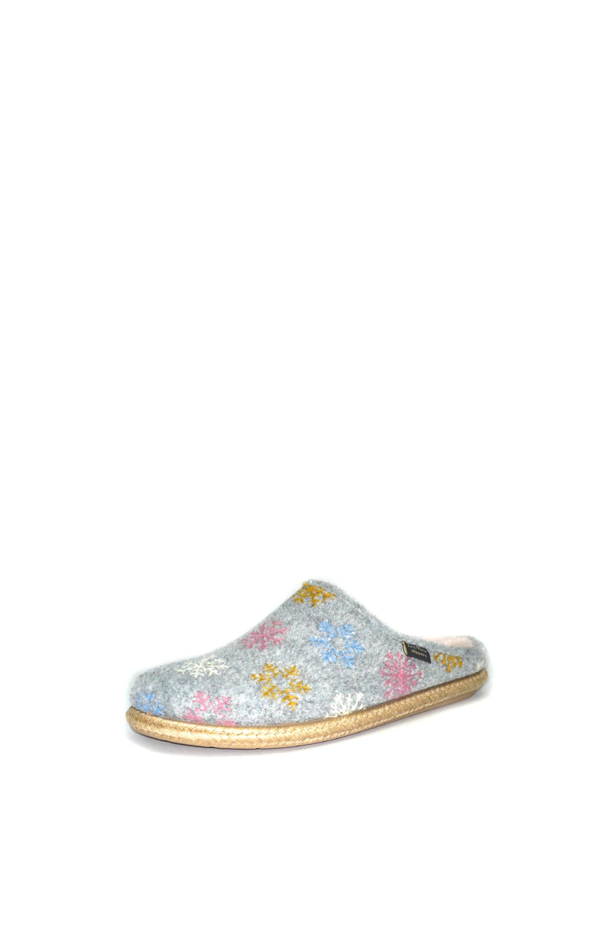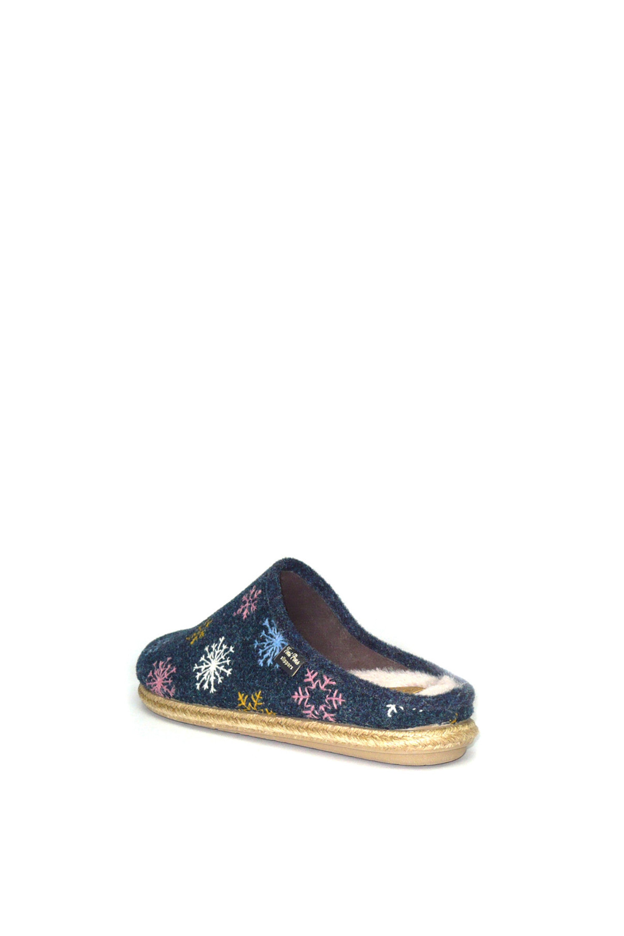 Pantofola aperta da donna in feltro a tinta unita, con un ricamo di motivi invernali. L'interno è rivestito con morbido pelo. La suola è piatta, ha uno spessore di 1 cm ed è in gomma antiscivolo e intreccio di juta. Ha una soletta rimovibile con un cuneo di 2 cm sul tallone. Questo modello calza la taglia abituale, se sei tra due numeri scegli una taglia più piccola. Non è consigliabile lavare le slipper in lavatrice. Ti consigliamo di consultare la guida per la cura per sapere come conservarle.