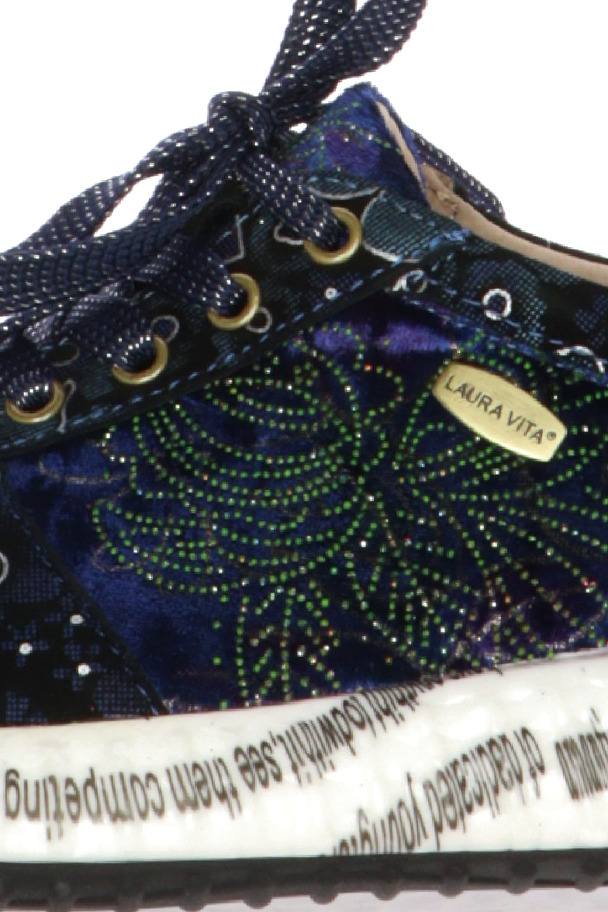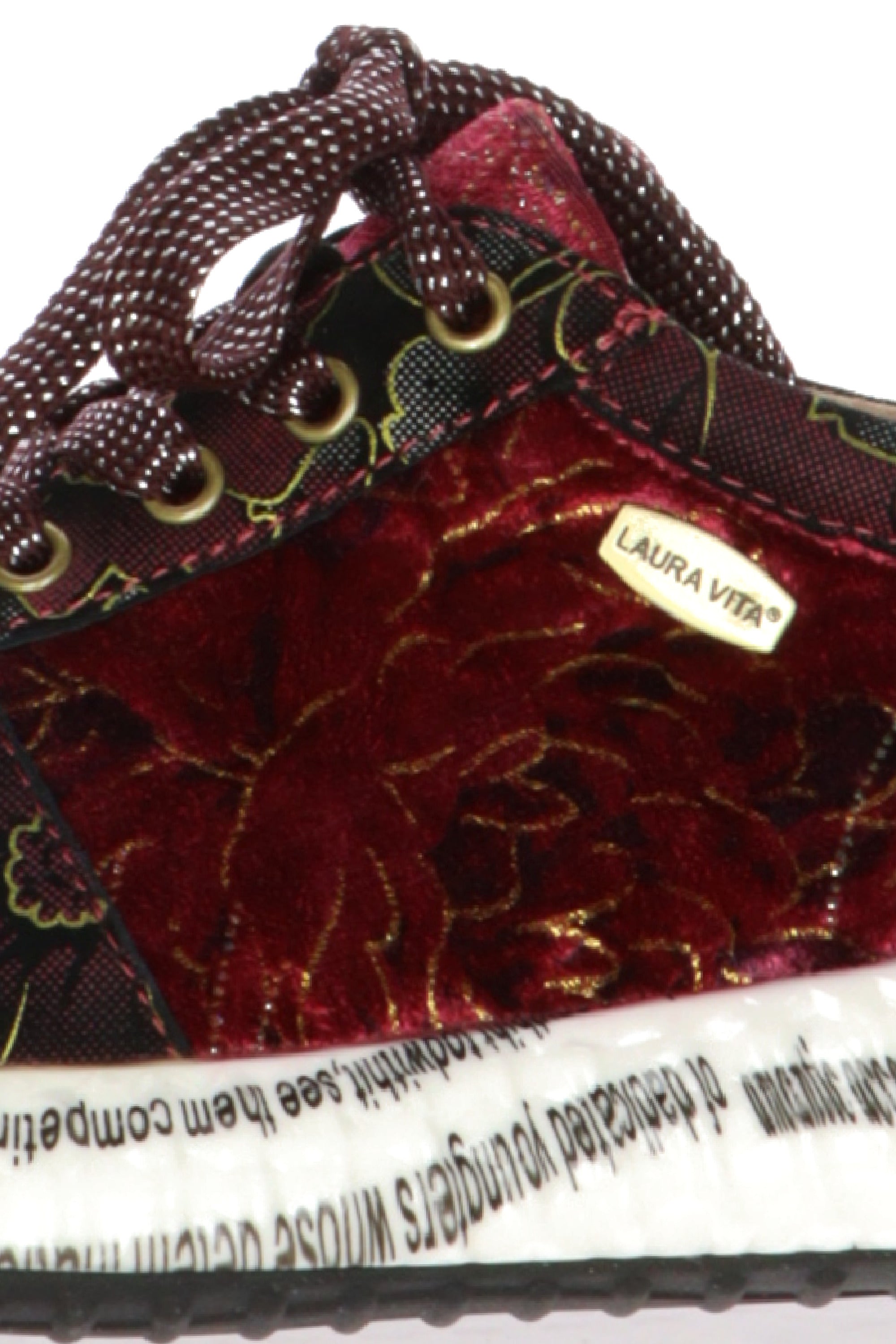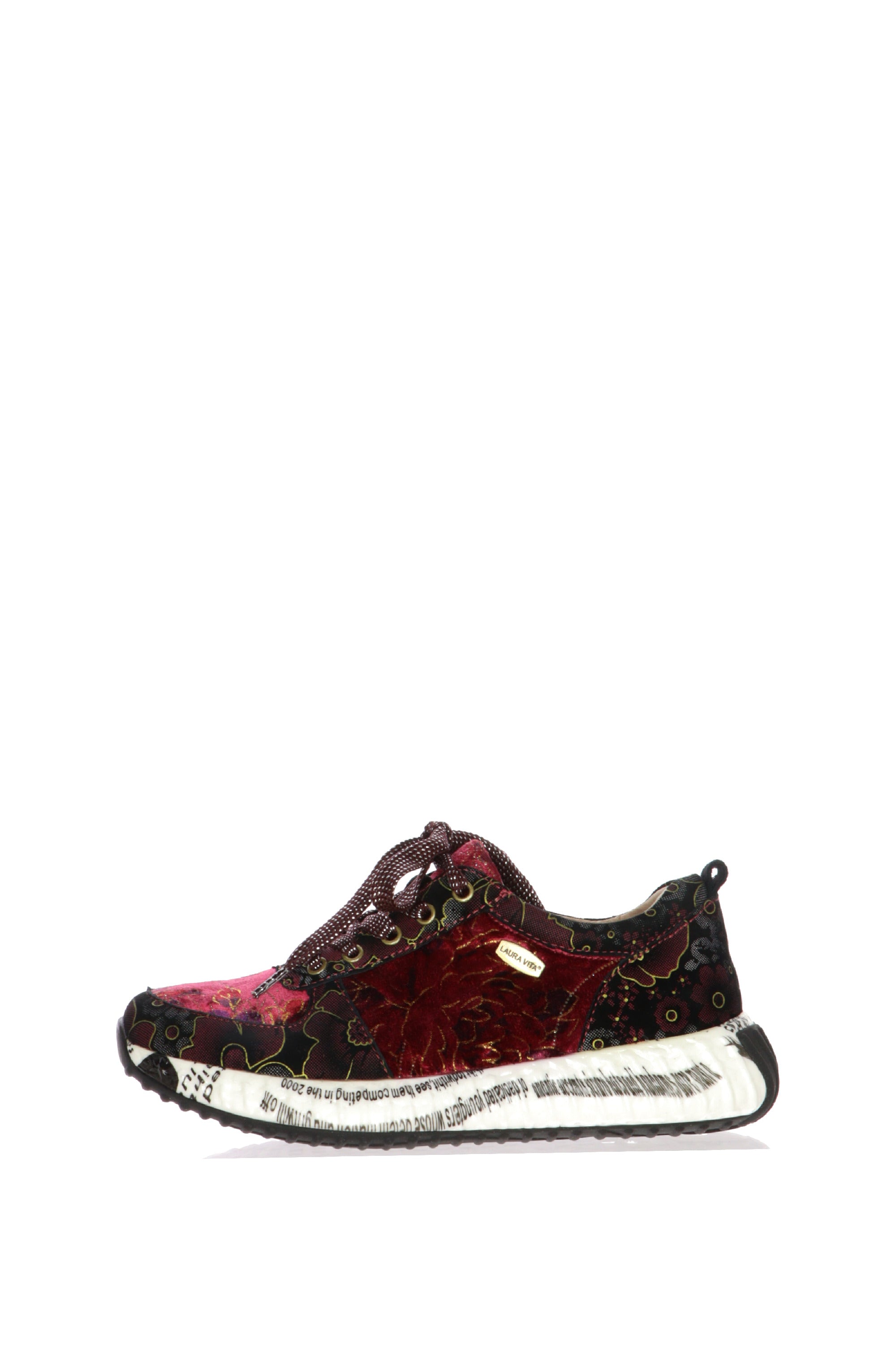 Entra nel mondo vibrante e unico di Laura Vita con queste straordinarie sneakers da donna in velluto. L'accessorio perfetto per chi ama esprimere la propria personalità attraverso uno stile audace e inconfondibile.Queste sneakers sono un vero e proprio capolavoro di design, realizzato con un mix di velluto rosa bordeaux e tessuto stampato a fantasia floreale scura. I dettagli non passano inosservati: l'etichetta dorata con il logo "Laura Vita" e le stringhe bordeaux aggiungono un tocco di eleganza. La suola bianca è un elemento di design distintivo, con una stampa grafica che conferisce un'allure artistica e contemporanea.Oltre allo stile, queste scarpe offrono un comfort eccezionale. La suola ammortizzata e la calzata avvolgente garantiscono il massimo benessere per tutto il giorno, rendendole ideali per camminare con leggerezza e stile.