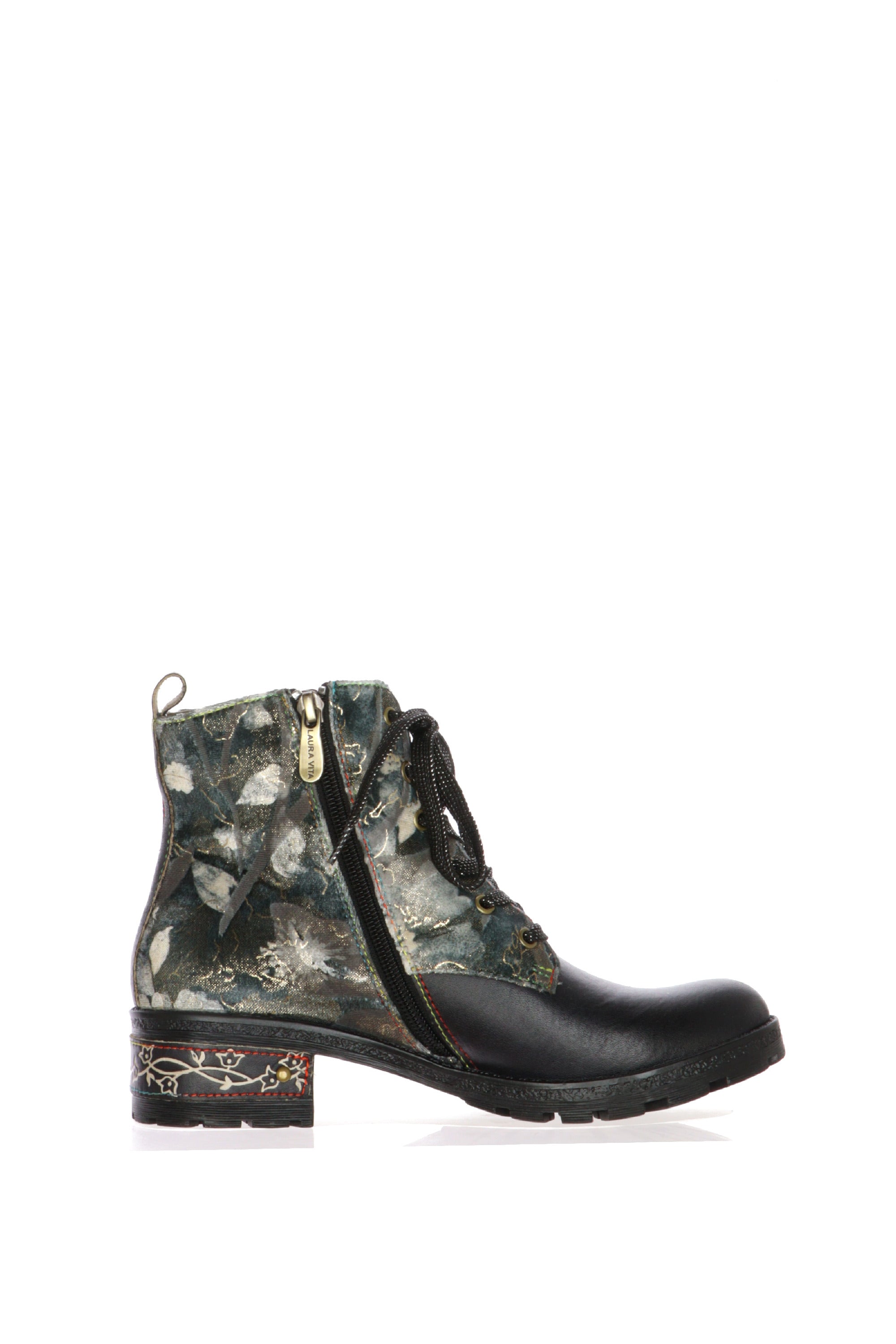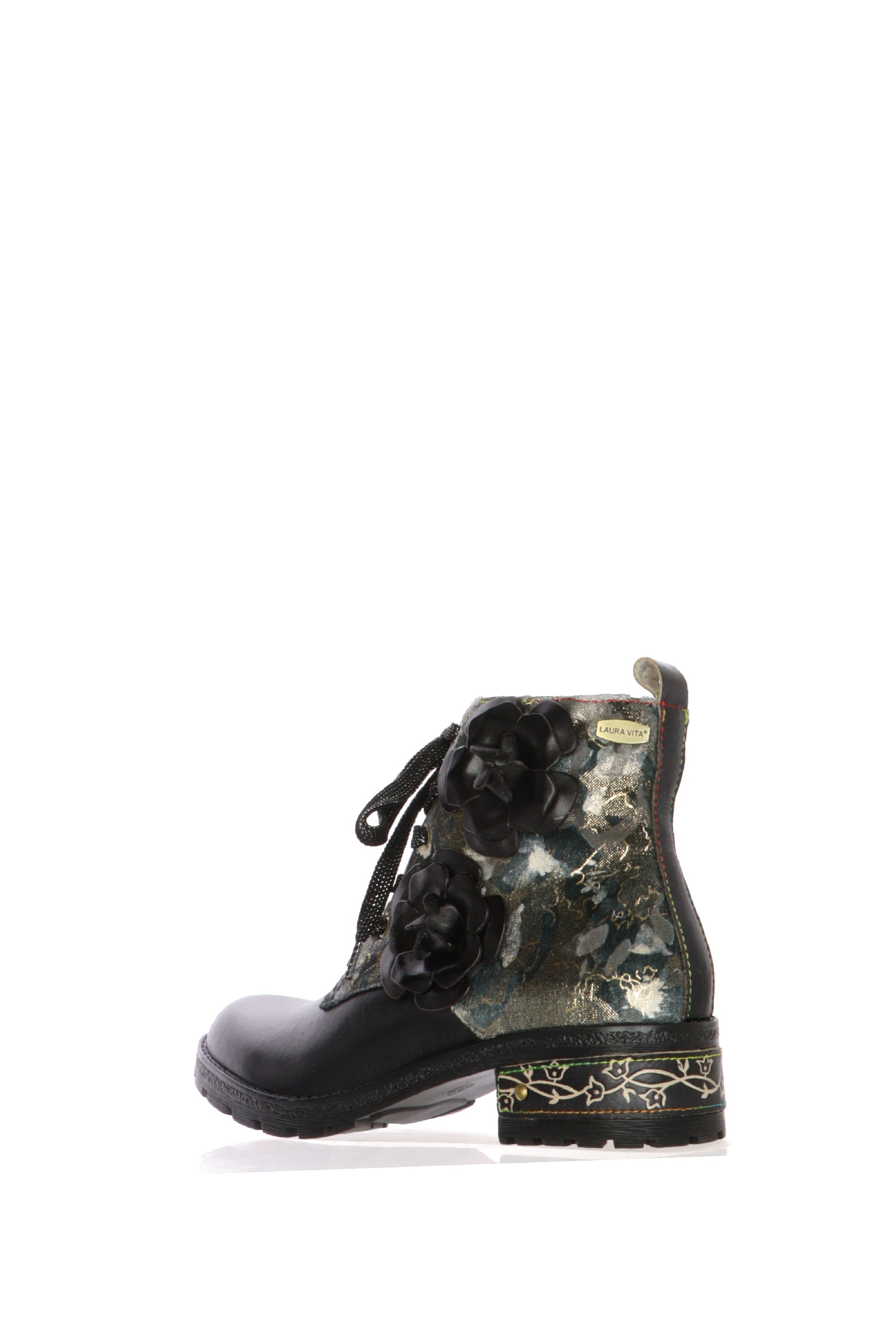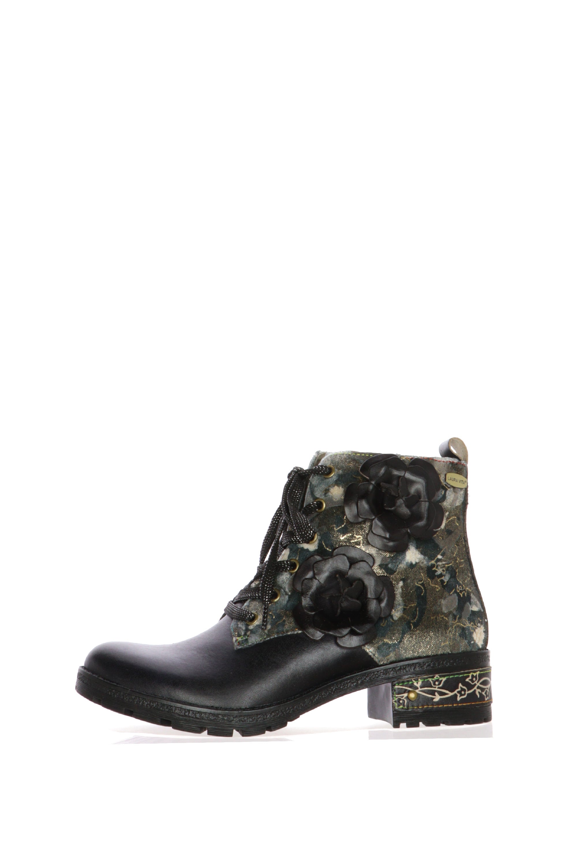 Esprimi la tua personalità con lo stivaletto da donna Laura Vita, un capolavoro di design che unisce grinta e romanticismo. Ideale per chi non ha paura di osare, questa calzatura è un accessorio unico che non passerà inosservato.Questo stivaletto, con una silhouette che ricorda il classico anfibio, è reinventato con l'inconfondibile tocco artistico di Laura Vita. La parte inferiore è realizzata in similpelle nera, mentre la tomaia presenta un magnifico tessuto stampato a fantasia nei toni del verde, oro e blu, che crea un contrasto sofisticato. Il vero punto di forza sono i due grandi fiori 3D in pelle nera applicati sul lato esterno, che aggiungono profondità e femminilità al design. La suola carrarmato garantisce stabilità e un look deciso, completato da una piastrina decorativa sul tacco che racchiude l'attenzione per i dettagli tipica del brand.Perfetti per elevare un outfit casual con jeans o per dare un tocco originale a un look più elegante, questi stivaletti sono il mix perfetto tra stile e comfort.