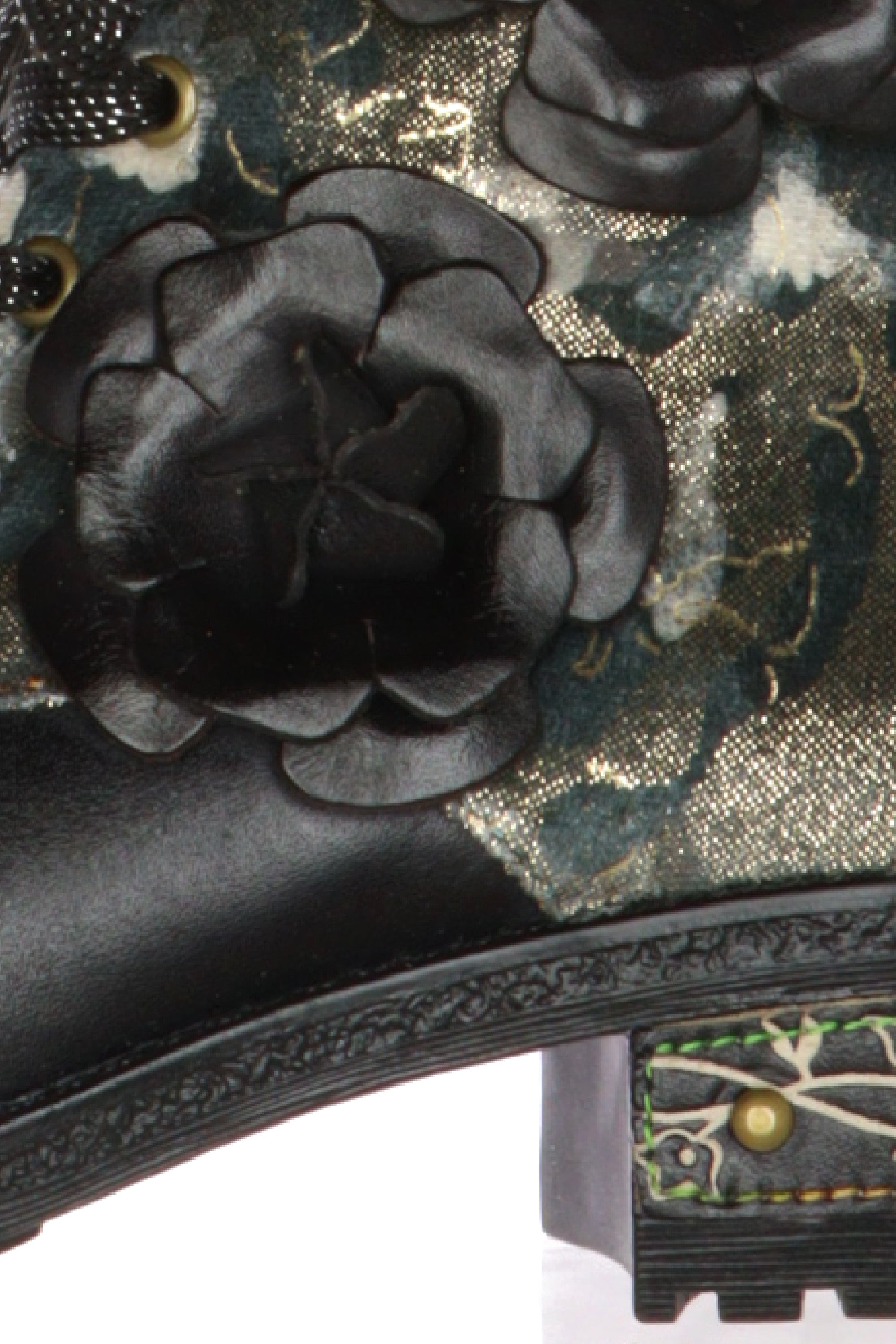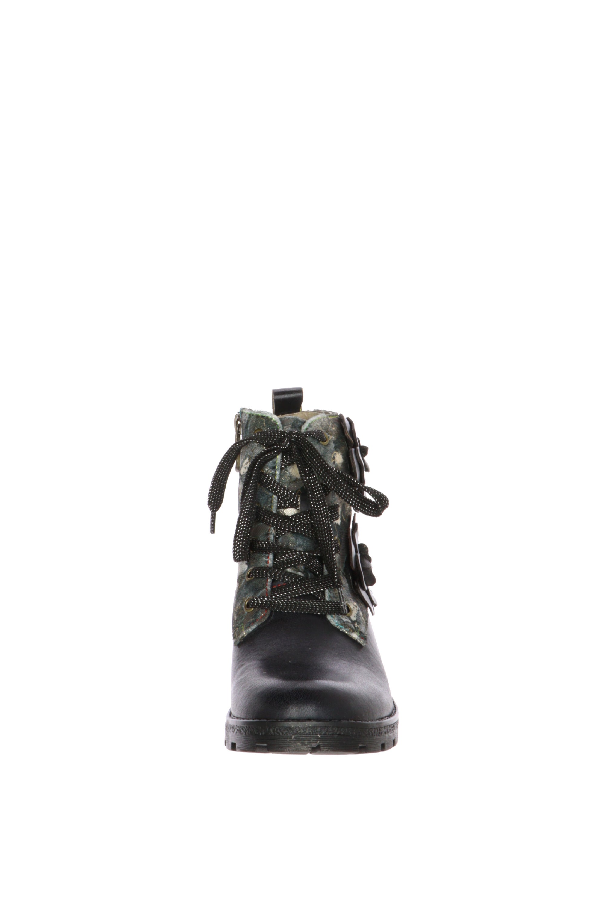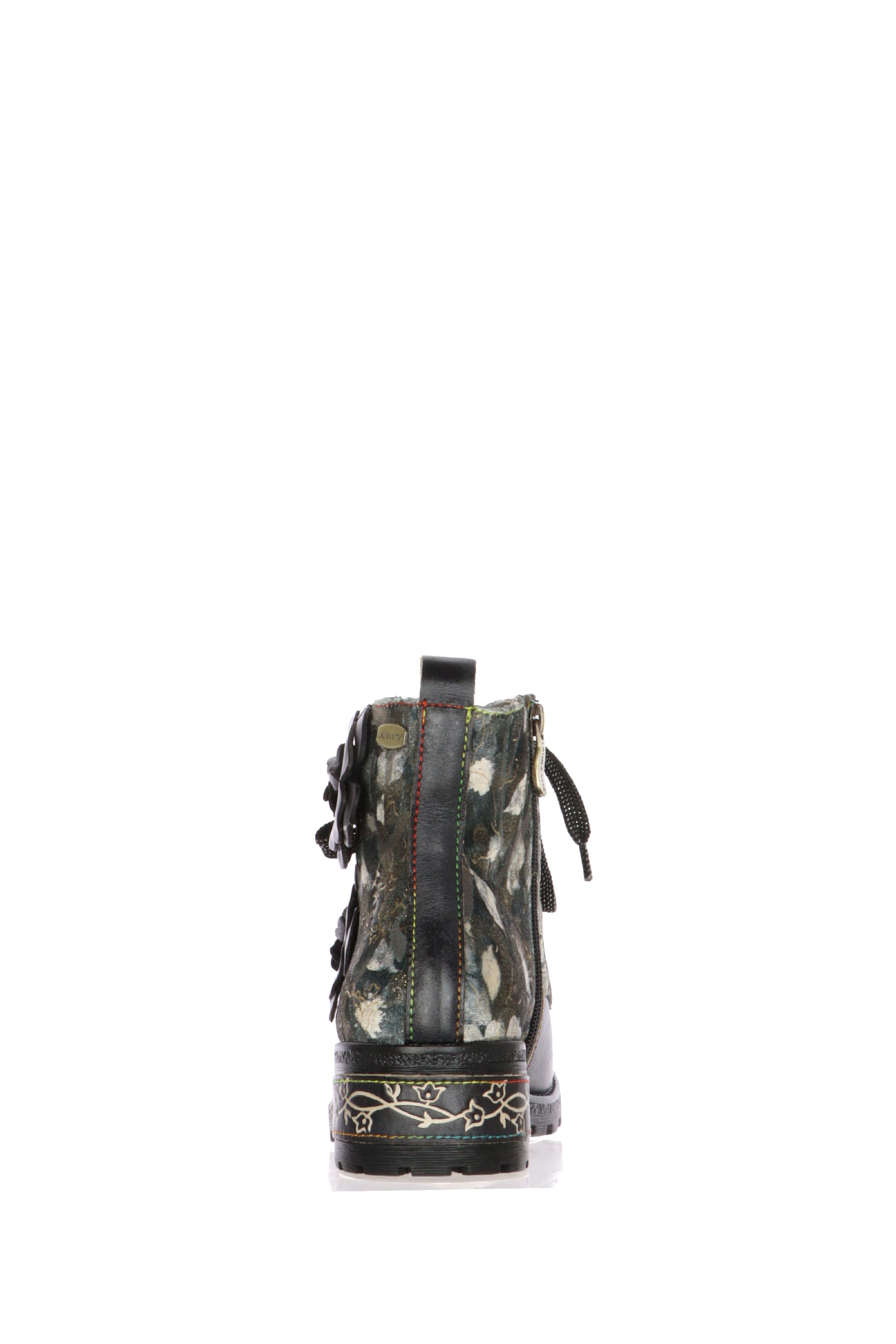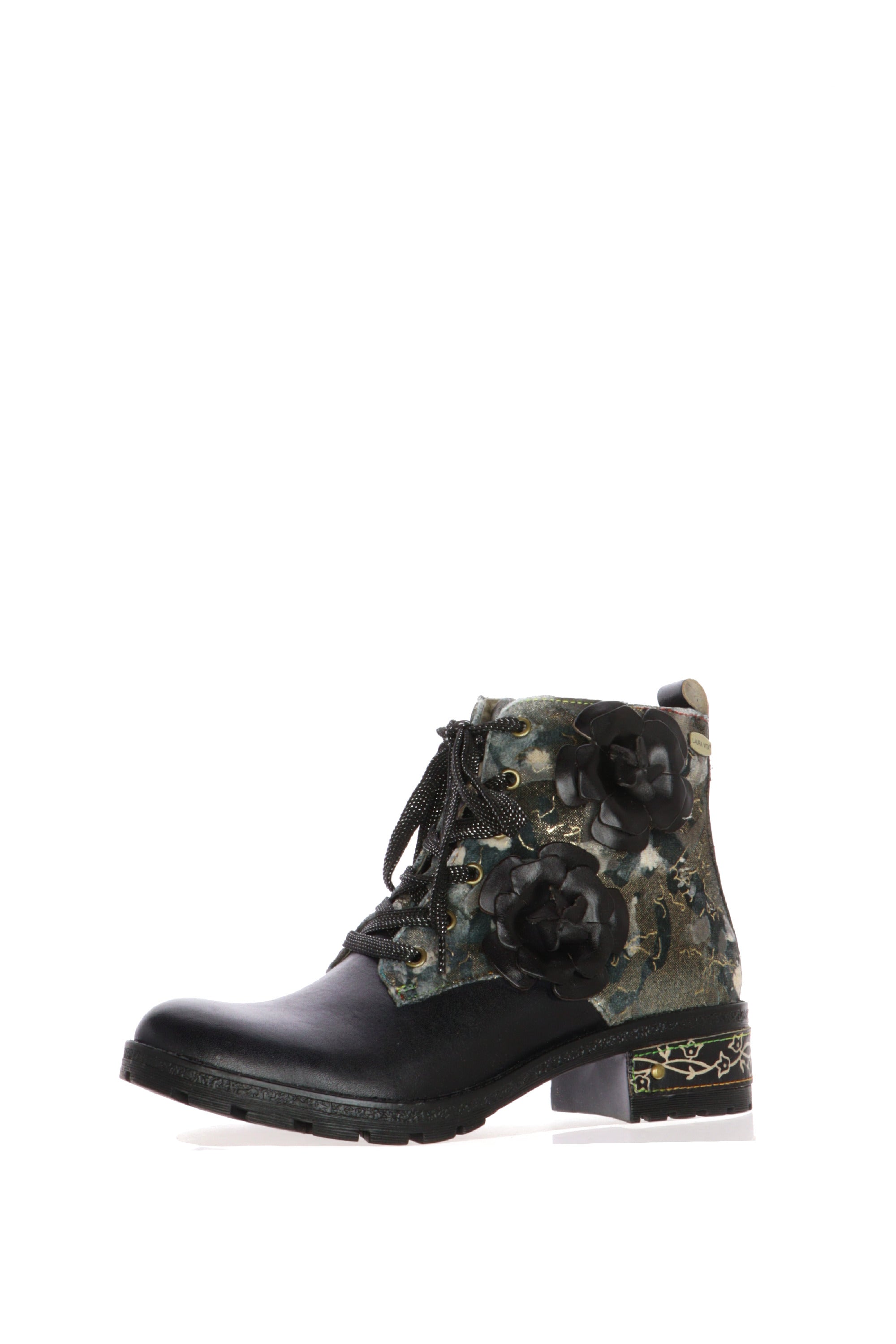 Esprimi la tua personalità con lo stivaletto da donna Laura Vita, un capolavoro di design che unisce grinta e romanticismo. Ideale per chi non ha paura di osare, questa calzatura è un accessorio unico che non passerà inosservato.Questo stivaletto, con una silhouette che ricorda il classico anfibio, è reinventato con l'inconfondibile tocco artistico di Laura Vita. La parte inferiore è realizzata in similpelle nera, mentre la tomaia presenta un magnifico tessuto stampato a fantasia nei toni del verde, oro e blu, che crea un contrasto sofisticato. Il vero punto di forza sono i due grandi fiori 3D in pelle nera applicati sul lato esterno, che aggiungono profondità e femminilità al design. La suola carrarmato garantisce stabilità e un look deciso, completato da una piastrina decorativa sul tacco che racchiude l'attenzione per i dettagli tipica del brand.Perfetti per elevare un outfit casual con jeans o per dare un tocco originale a un look più elegante, questi stivaletti sono il mix perfetto tra stile e comfort.