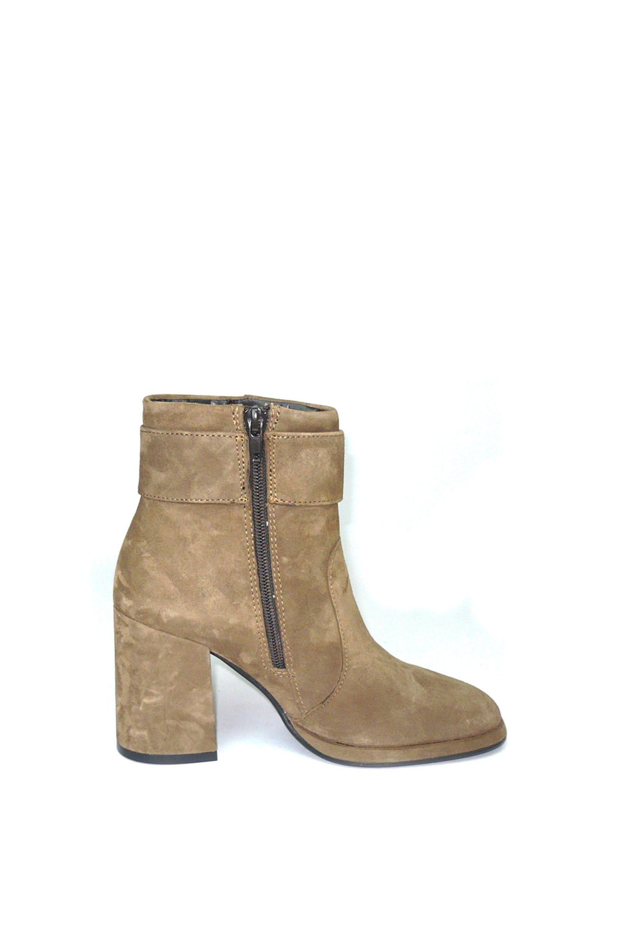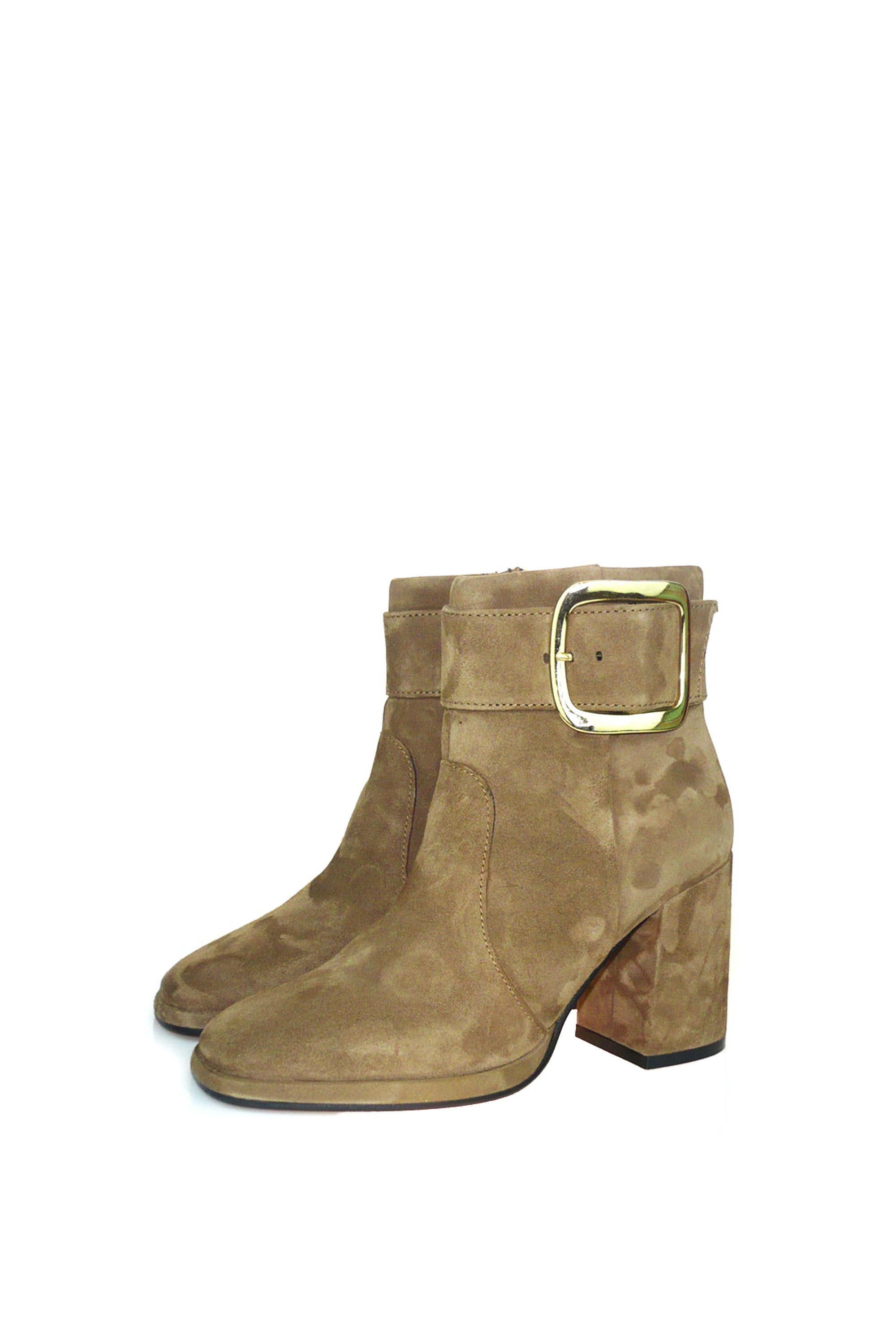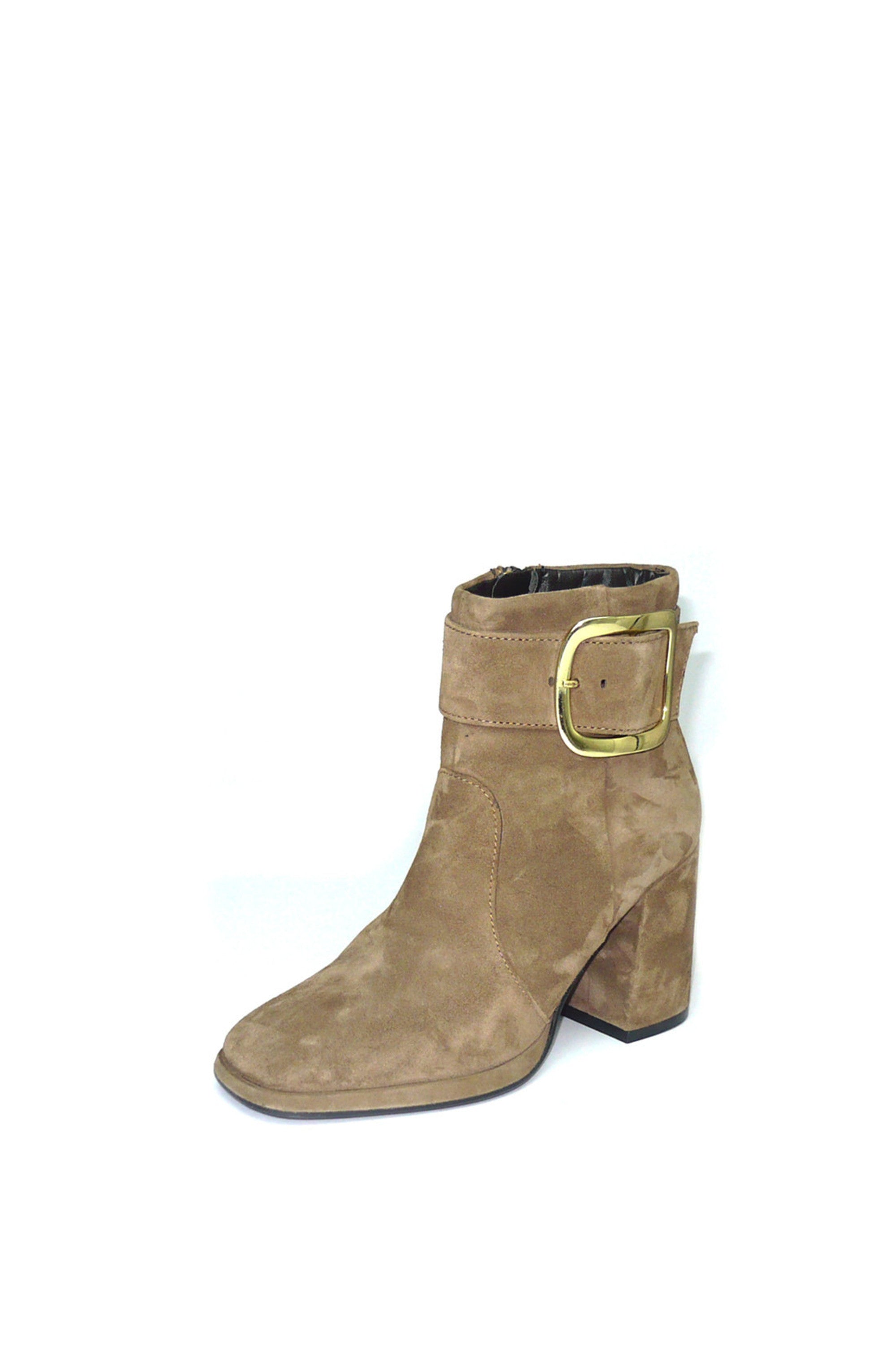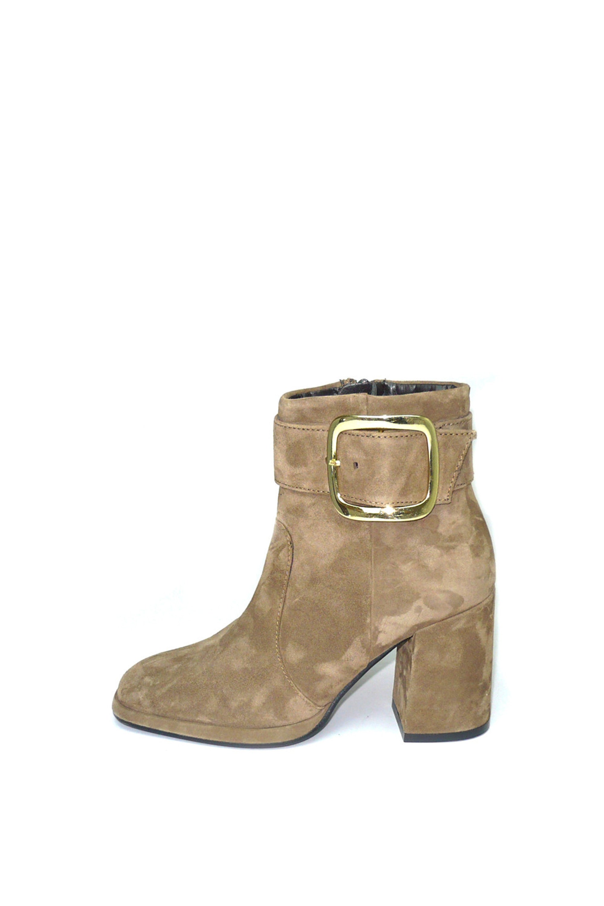Stivaletto in morbido camoscio color taupe con fibbia design. Punta squadrata, tacco doppio e alto, la tendenza dell'inverno racchiusa in un modello comodo e versatile. CafèNoir