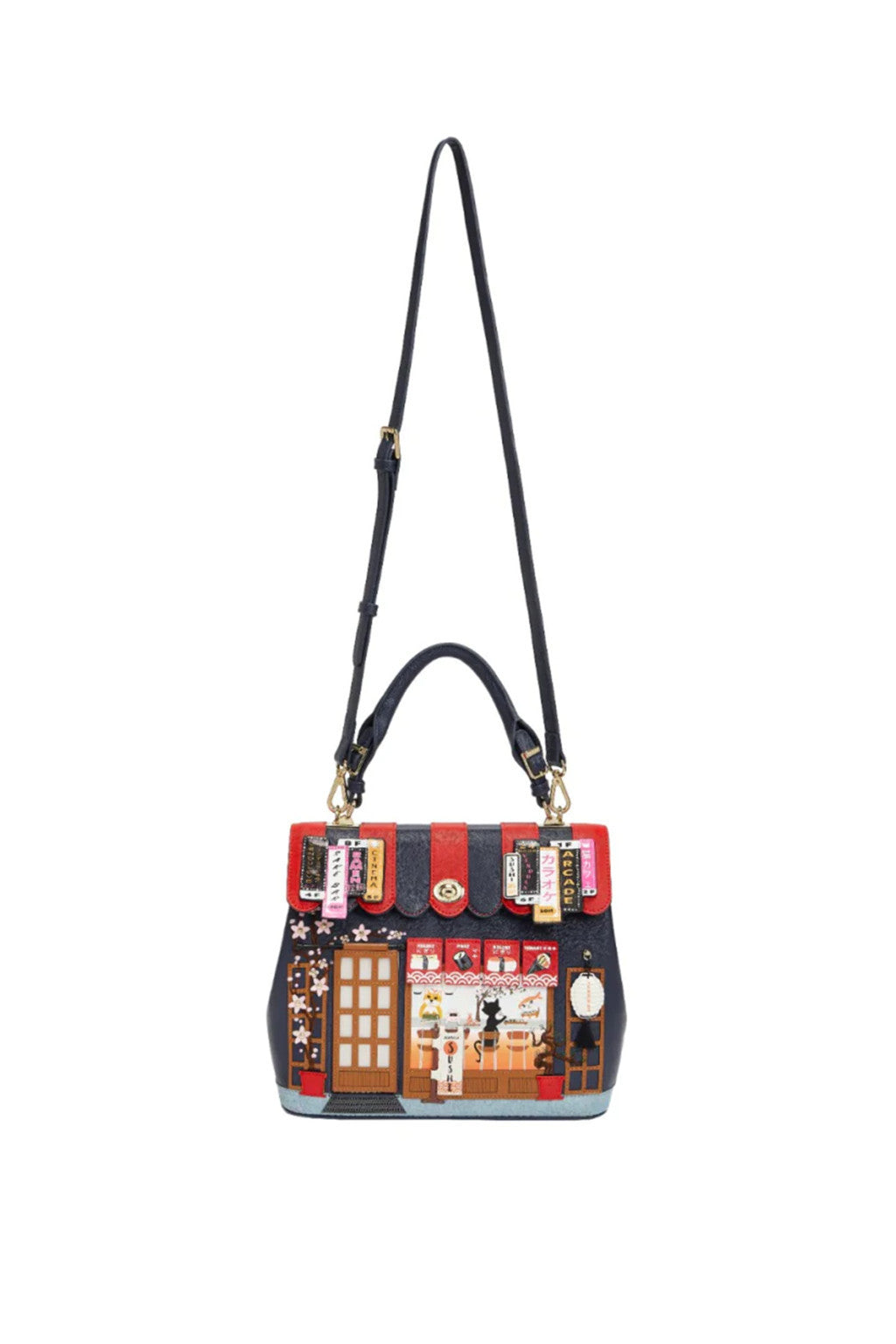Se l’hai adorata nella versione grigia, impazzirai per questa nuova variante di colore! La Borsa Grace Vendula Sushi - Blue Edition è un must per l’uso quotidiano. È realizzata in pelle vegana, con un comparto spazioso e alcune tasche nascoste sotto un incantevole patta nera e rossa a forma di tenda. È dotata sia di un comodo manico che di una cinghia rimovibile per una maggiore versatilità. Ha anche dei piedini alla base per mantenere la borsa pulita e stabile. Decorata con delle insegne al neon, una porticina apribile e i nostri amati chef pelosi, questa borsa ti trasporta in un vivace ristorante di sushi pieno di vita e… sapore! Mangi qui o preferisci l’asporto?
