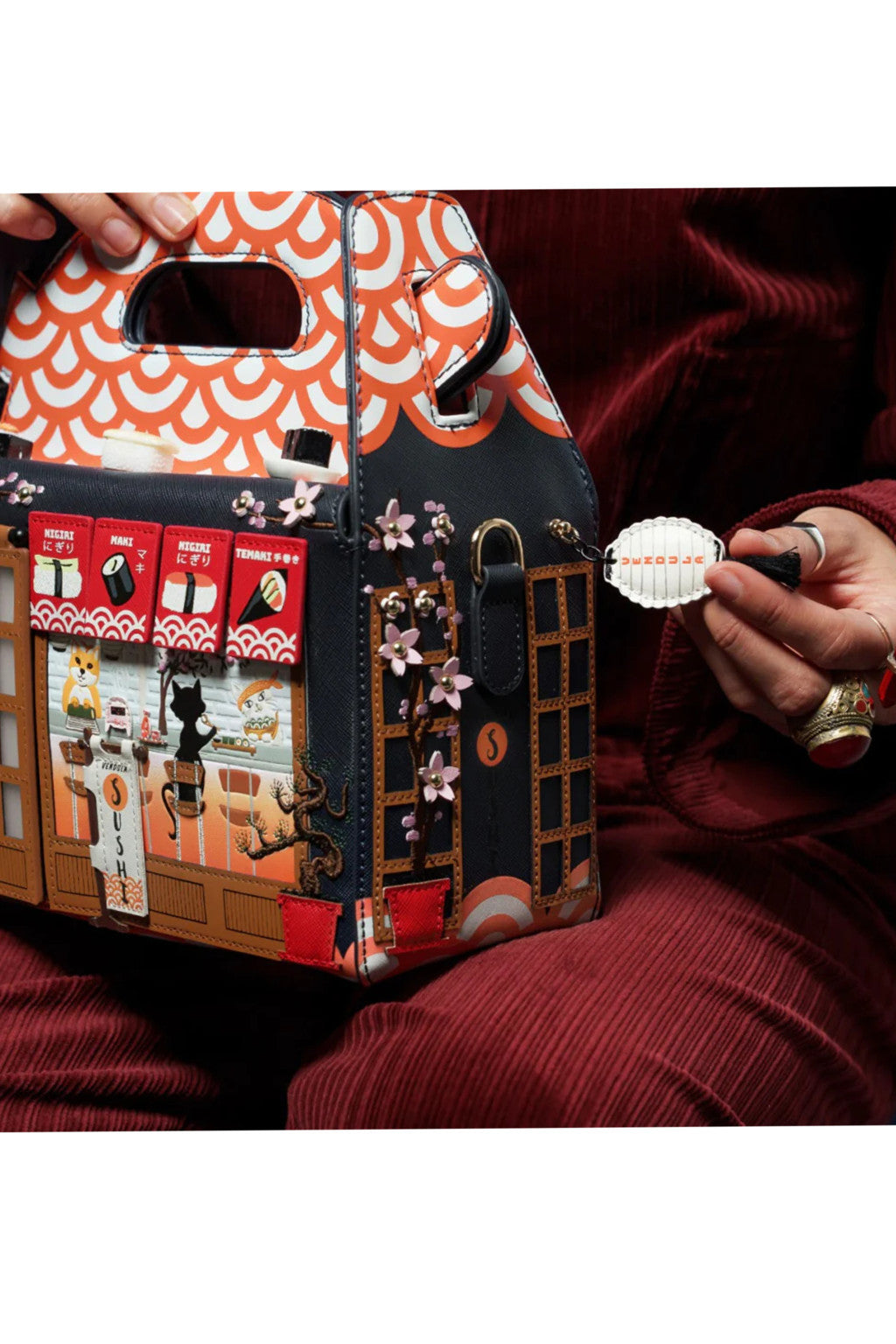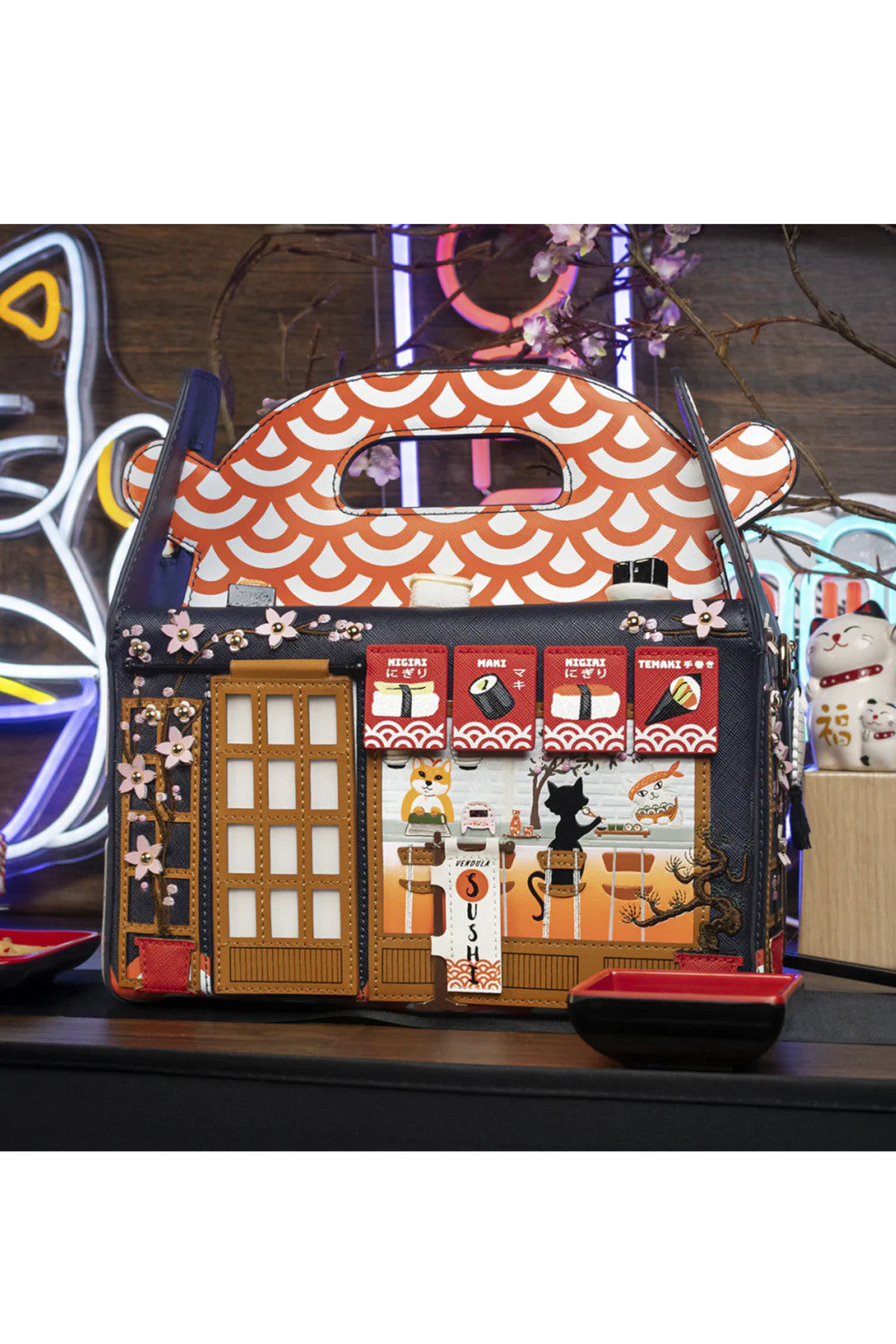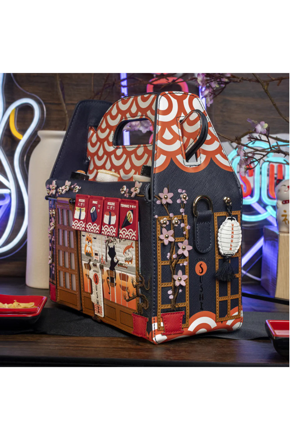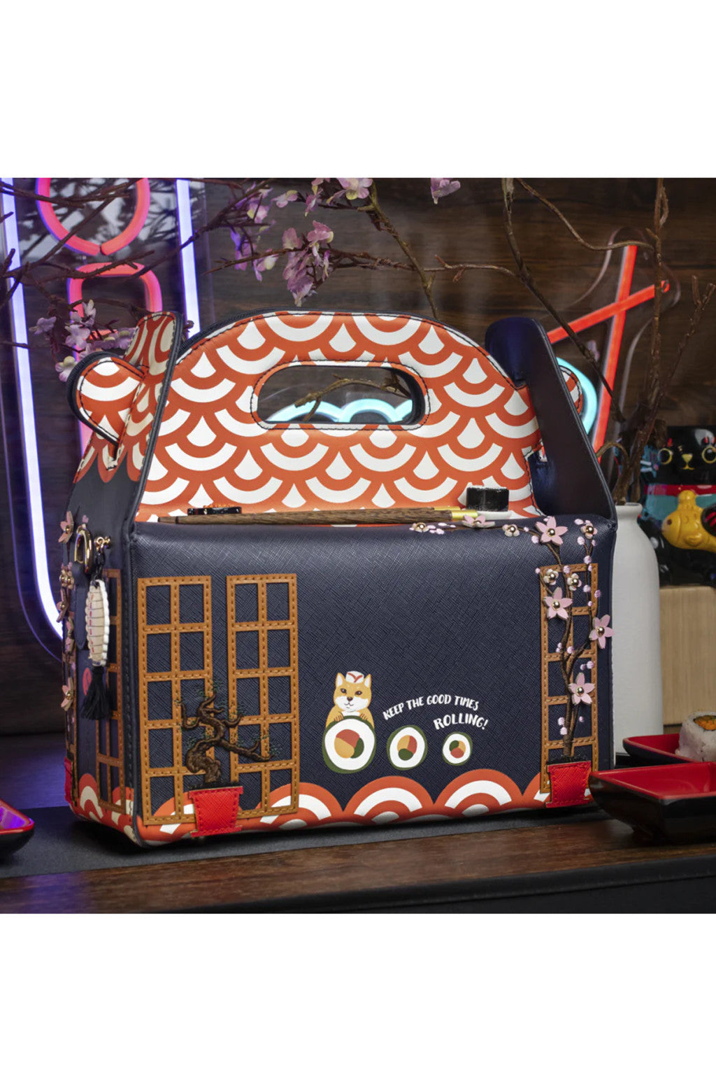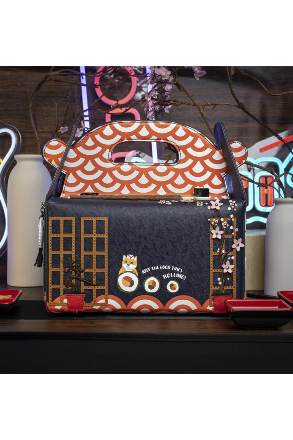 Assapora l’audacia con la Borsa ''Takeaway Box'' Vendula Sushi - Blue Edition! Ispirata alle vere scatole da asporto, questa borsa originale ha i manici tagliati al laser, le bacchette di legno e persino i ciondoli a tema sushi per un effetto “appena uscito dalla cucina”. Realizzata in pelle vegana con un interno spazioso e una cinghia regolabile, unisce giocosità e praticità. I dettagli stampati ispirati al ristorante di sushi e le nappine a forma di lanterna rossa la rendono un pezzo d’effetto da ogni punto di vista. Preparati a suscitare l’interesse della città… e forse anche del tuo ristorante di sushi preferito!